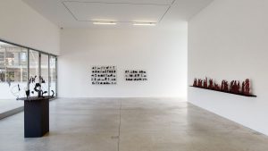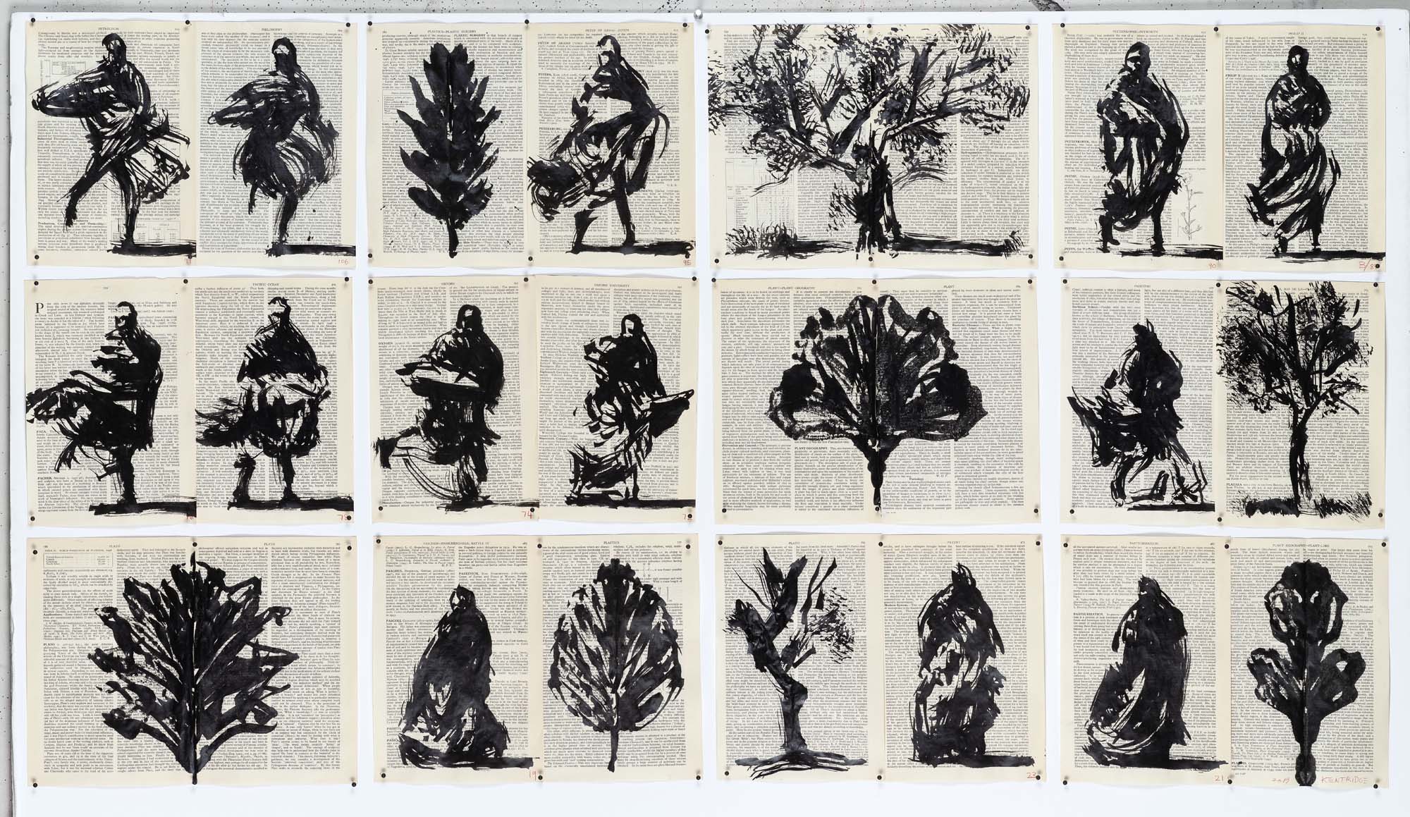 Al piano terra, tra una carrellata di pagine dipinte, va guardato dall’inizio alla fine il video omonimo, un “flipbook” , animato da una sequenza di disegni ad inchiostro e carboncino presentato per la prima volta nella galleria milanese, dove la Sibilla ci appare nelle vesti di una saettante danzatrice africana contemporanea che si muove vorticosamente, sulle composizioni vocali di Nhlanhla Mahlangu, sullo sfondo di pagine di libri in cui l’inchiostro tratteggia alberi con rami e foglie nero pece che si scompaginano e rimescolano, proprio come foglie morte in balia del vento, riportando profezie in cui un algoritmo indica l’esito del nostro destino, come una nuova Sibilla. Queste immagini mostrano alberi, oggetti animati, forme geometriche colorate e figure in trasformazione su pagine della Divina Commedia, restituiscono vita e umanità a una figura mitologica lontana nel tempo, oggi come ieri profetessa delle incertezze, del futuro e dell destino inconoscibile degli uomini. Al primo piano troverete i set di piccole sculture in bronzo come Lexicon (2017) e Paragraph I (2018), le sculture d’acciaio e alluminio Leaf/Ampersand (2019), e Returning Leaf (2019), elementi apparentemente statici, simili a caratteri tipografici che si trasformano come si vede nel video e nei disegni e ricompaiono in forme e combinazioni diverse, tutto dipende dal punto di vista da cui si guardano. Queste sculture e la lunga sequenza di figure in bronzo Processione di Riparazionisti (2019), e carboncini con lo stesso titolo che riproducono le grandi silhouettes in acciaio rigido dell’opera monumentale ideata per OGR di Torino (in collaborazione con il Castello di Rivoli Museo d’Arte Contemporanea) ispirate agli operai e macchine fisse di quel luogo, ove si riparavano i treni, come le Sibille sono presupposti per inscenare in modalità diverse le dinamiche del movimento, della nostra civiltà industriale, della migrazione verso il Nord di uomini alla ricerca di lavoro in fabbrica, per un futuro migliore tra fatica umana e speranza, temi universali ricorrenti nel lavoro di Kentridge.
