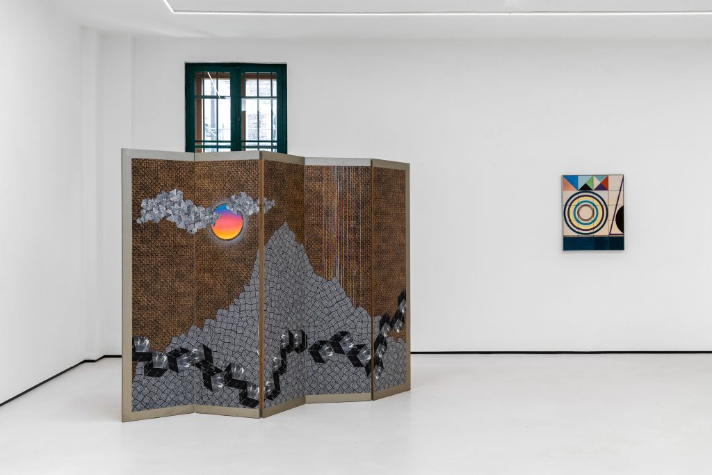 Claudia Wieser propone un paravento già realizzato prima della mostra corrente, che si presenta come un collage di diverse tecniche, principalmente segni grafici e piani cartacei che creano un’illusione prospettica architettonica. L’opera scelta, per i suoi caratteri geometrici astratti, entra in contrapposizione con le altre creando un dialogo originale. Il rapporto con l’idea di arredo si materializza nelle opere in cui utilizza materiali come le piastrelle: si tratta perciò di sculture che esplorano il confine tra arti visive e design.