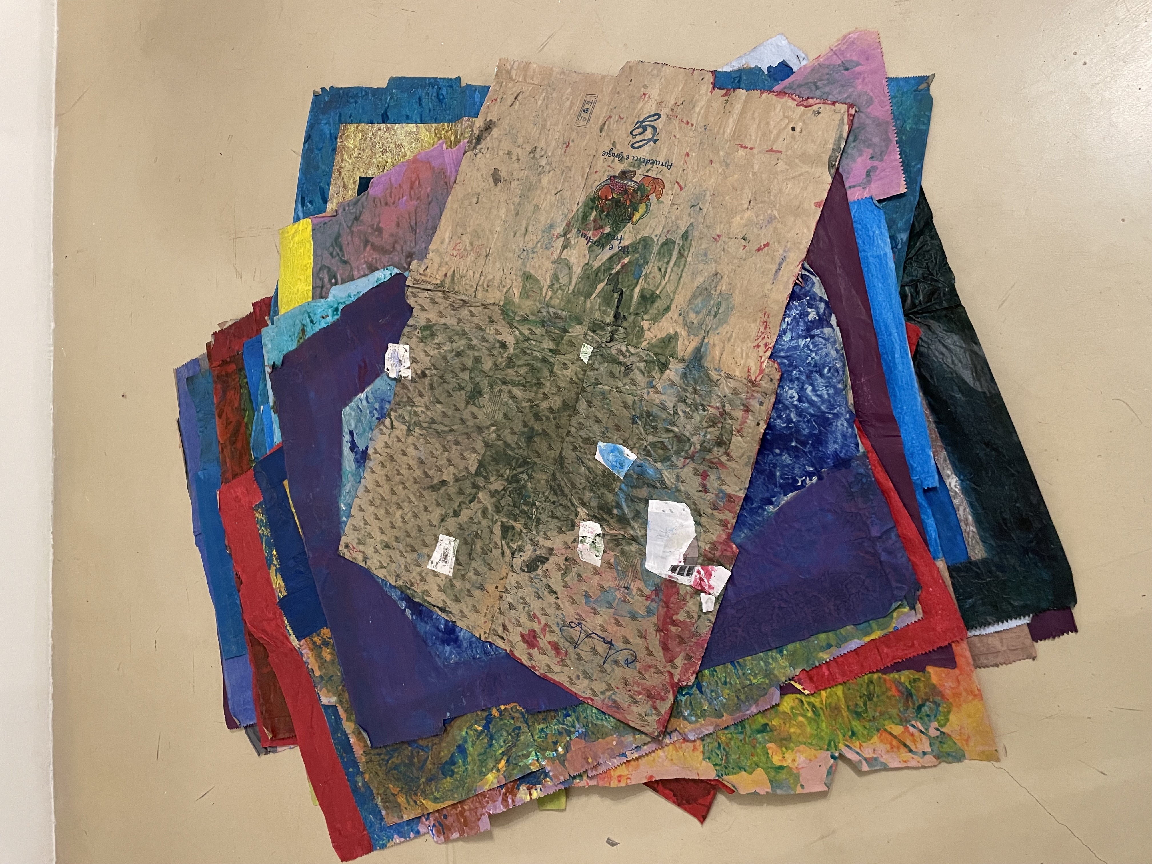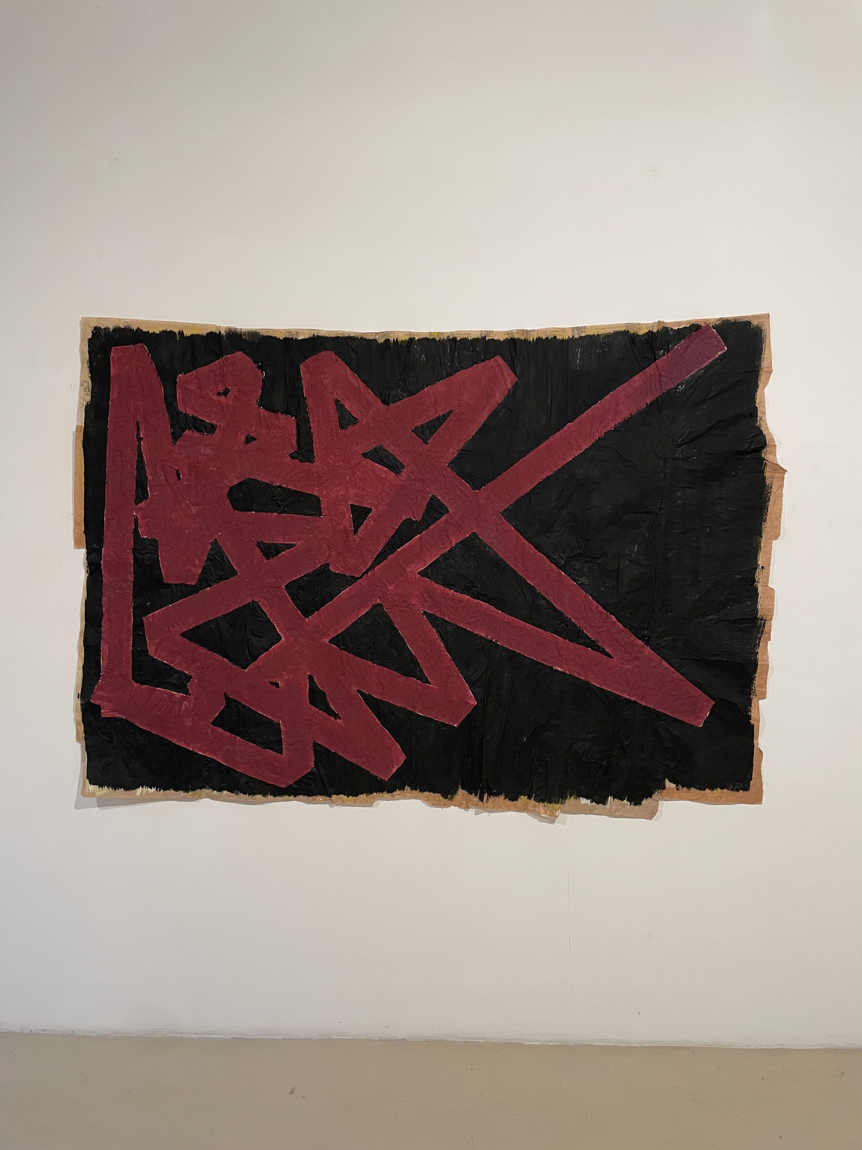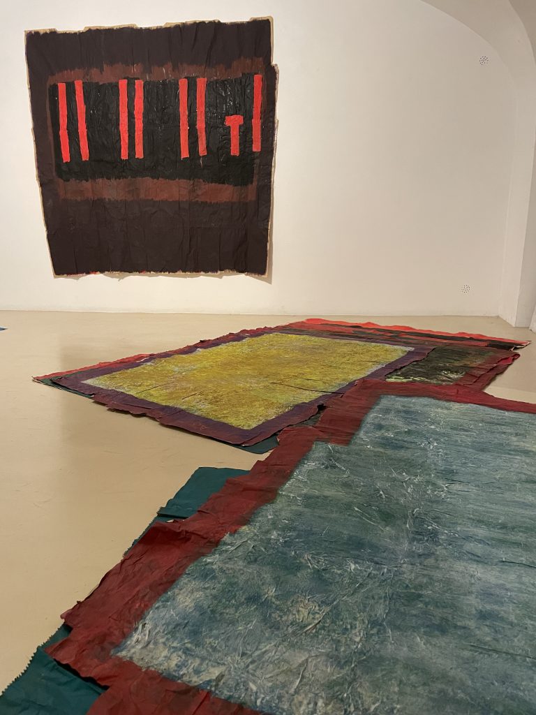 La materia prima di Malakkaran è la carta paglia sin da quando, ragazzo, nella sua casa in Kerala raccoglieva le buste usate per incartare frutta, verdura, oggetti e le stendeva come tele sulle quali realizzava i suoi dipinti. La stessa materia prima che ha usato nel lavoro presentato qui a Roma: ha raccolto la carta che viene comunemente usata per avvolgere alimenti ed oggetti, l’ha stesa e ci ha dipinto sopra strati su strati di colore, creando un rapporto dialettico tra le pennellate e la carta che man mano, impregnandosi, si increspa, si imbarca e restituisce al colore una profondità ed una matericità nuovi. I formati dei suoi quadri sono diversi, ma sempre abbastanza grandi perchè il colore possa esprimere la sua forza. Alcuni sono tagliati in modo da avere forme geometriche, altri seguono la forma – irregolare – con cui è stata stesa la carta, altri ancora sono circondati da una cornice di colore che delimita e concentra il campo visivo. In alcuni quadri, è impossibile non ritrovare i richiami al paese natio, con l’uso dei colori che richiamano quelli della terra e delle spezie indiane, in altri possiamo invece ritrovare l’universalità del linguaggio della pittura.
