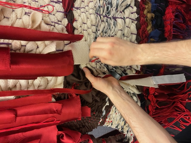 Il lavoro di Thomas De Falco nasce come se fosse un cordone ombelicale, come un organo che cresce, come arterie e vene che diramano. Comprendere una simile immagine è possibile riconoscendo nella sua scultura tessile una natura morta che parla attraverso la sua performance – intesa come rito che alimenta un messaggio. Non è un gioco di parole, è anzi la più generosa chiave di lettura che l’artista ci offre: «la performance non esiste senza scultura tessile, la scultura tessile non esiste senza il corpo del performer». Il suo eseguire artistico ha un tratto essenziale, ovvero la capacità di condurre l’azione nel margine più o meno stretto, ma densamente ricco di possibilità, che si apre tra il preordinato, ovvero la partitura, e il contingente, ovvero l’occasione concreta di ogni singola azione.