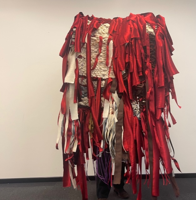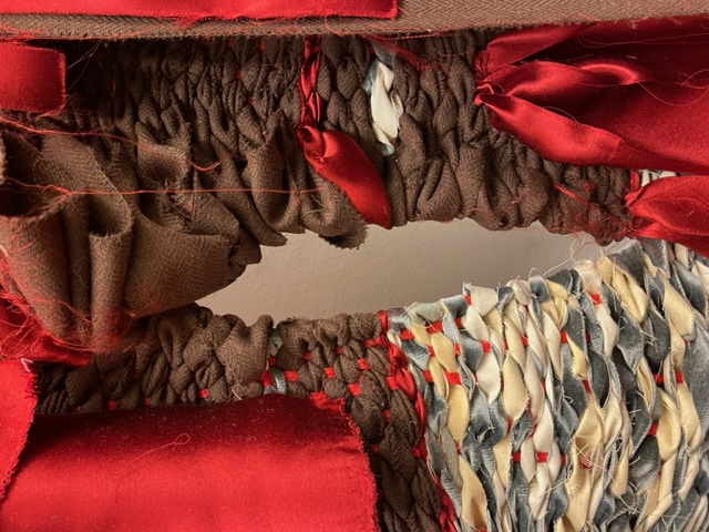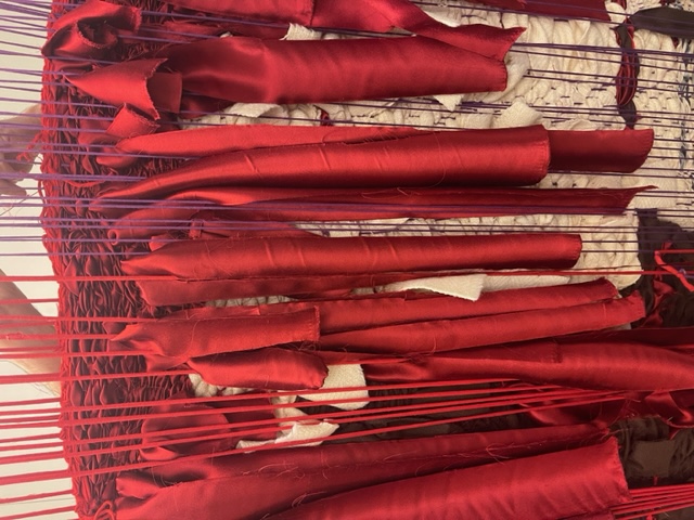 Il nuovo arazzo di Thomas De Falco combina differenti tonalità di rosso. Non solo nella performance W – Natura morta compariva un piccolo particolare di questo colore, ma De Falco, da sempre appassionato studioso, ancora prima del suo esordio artistico era solito sottolineare parole chiave con il rosso e creare nei suoi quaderni delle linee che nell’opera esposta sono andate materializzandosi nella forma del wrapping. «All’inizio del mio percorso – racconta De Falco – scelsi il rosso perché volevo far capire che dietro la facciata impeccabile del bianco e del nero si nascondeva un senso di dolore costante. Poi man mano, e talvolta anche per caso, il rosso è diventato una presenza fondamentale».