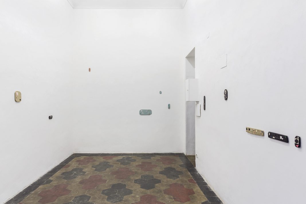 «I materiali sono sintetici perché le idee sono sintetiche», afferma l’artista canadese. Gli ambient tokens, simili a lastre, sono realizzati con argilla epossidica. Il materiale, utilizzato per la riparazione subacquea di tubature navali, si asciuga molto rapidamente. Di conseguenza, la pratica scultorea di Zin Taylor mantiene una sorta di memoria performativa. Le opere sono inserite nello spazio come elementi in ascensione infinita, come se stessero levitando sulle pareti. Ma allo stesso tempo, dimostrano una presenza concreta dialogando con gli elementi architettonici e le componenti tecniche dell’ambiente, come le prese, le mascherine, il contatore, le scatole elettriche e le cementine del pavimento. Gli ambient tokens creano un codice visivo, divenendo unità semantiche di un linguaggio spaziale.