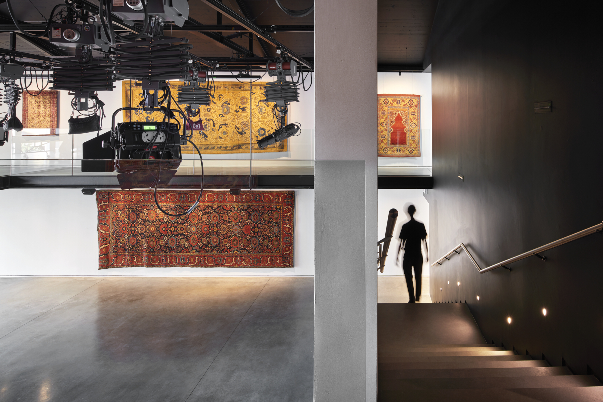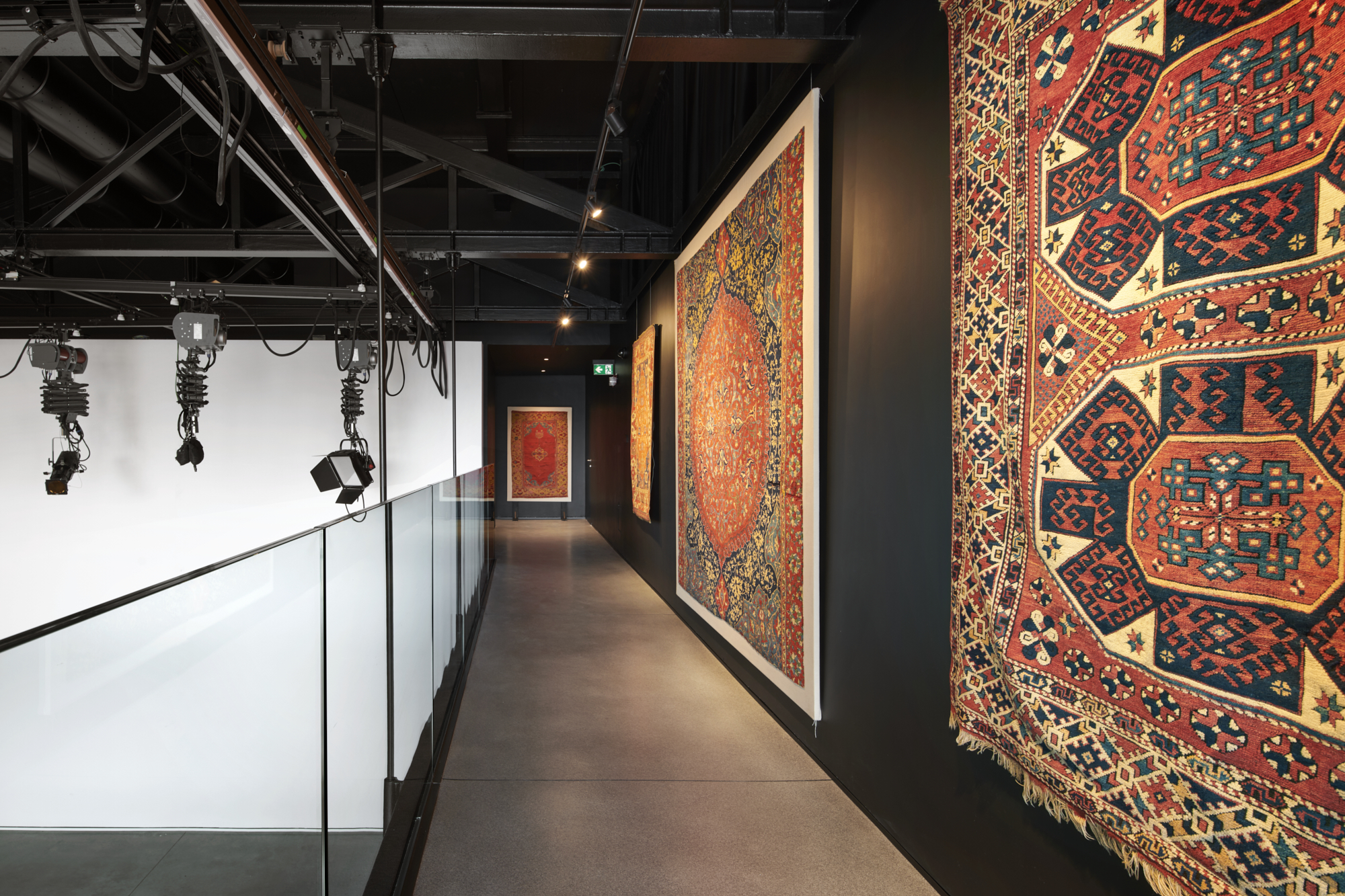 Tappeti di grande formato realizzati per palazzi o moschee e piccoli tappeti come quelli per le preghiere quotidiane, restituiscono una vivida narrazione fatta di figure, simboli e immagini astratte che permettono al visitatore di viaggiare nel tempo e nello spazio rimanendo con i piedi saldamenti ancorati a terra, inquadrati da una sapiente regia di luci che ne restituisce tutta la gamma cromatica.
