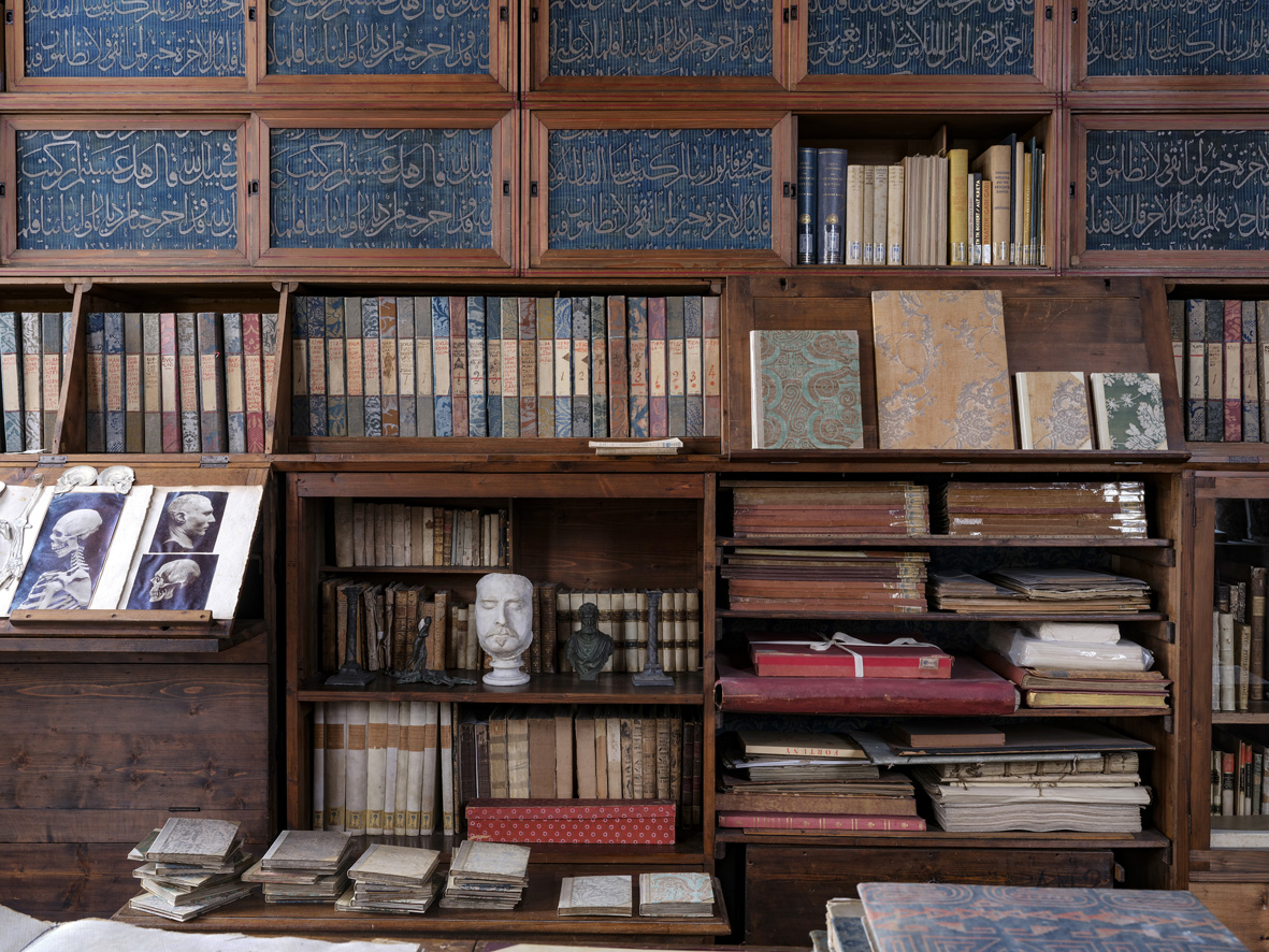Epicentro della creatività di Casa Fortuny, è la Biblioteca Privata di Mariano, il suo “pensatoio”, il luogo magico dove l’idea trovava spunto, prendeva forma e diventava prototipo. Quello che qui, per la prima volta, viene svelato al pubblico è uno straordinario cabinet d’amateur, una wunderkammer straripante di cose preziose, oggetti d’uso, curiosità, strumenti, documenti e volumi tra cui trattati illustrati di ogni epoca, l’intera “Ecyclopedie”, raccolte di incisioni, riviste, volumi d’arte e scienze. Gli armadi accolgono più di 150 album rivestiti con tessuti Fortuny e contenenti documentazione iconografica, la più diversa, schizzi, foto, appunti, ritagli e soprattutto immagini, infinite, ordinatissime, foto di dipinti, architetture, decori e fregi, ceramiche, armi: potenziali fonti di ispirazione per i motivi decorativi dei leggendari tessuti Fortuny.