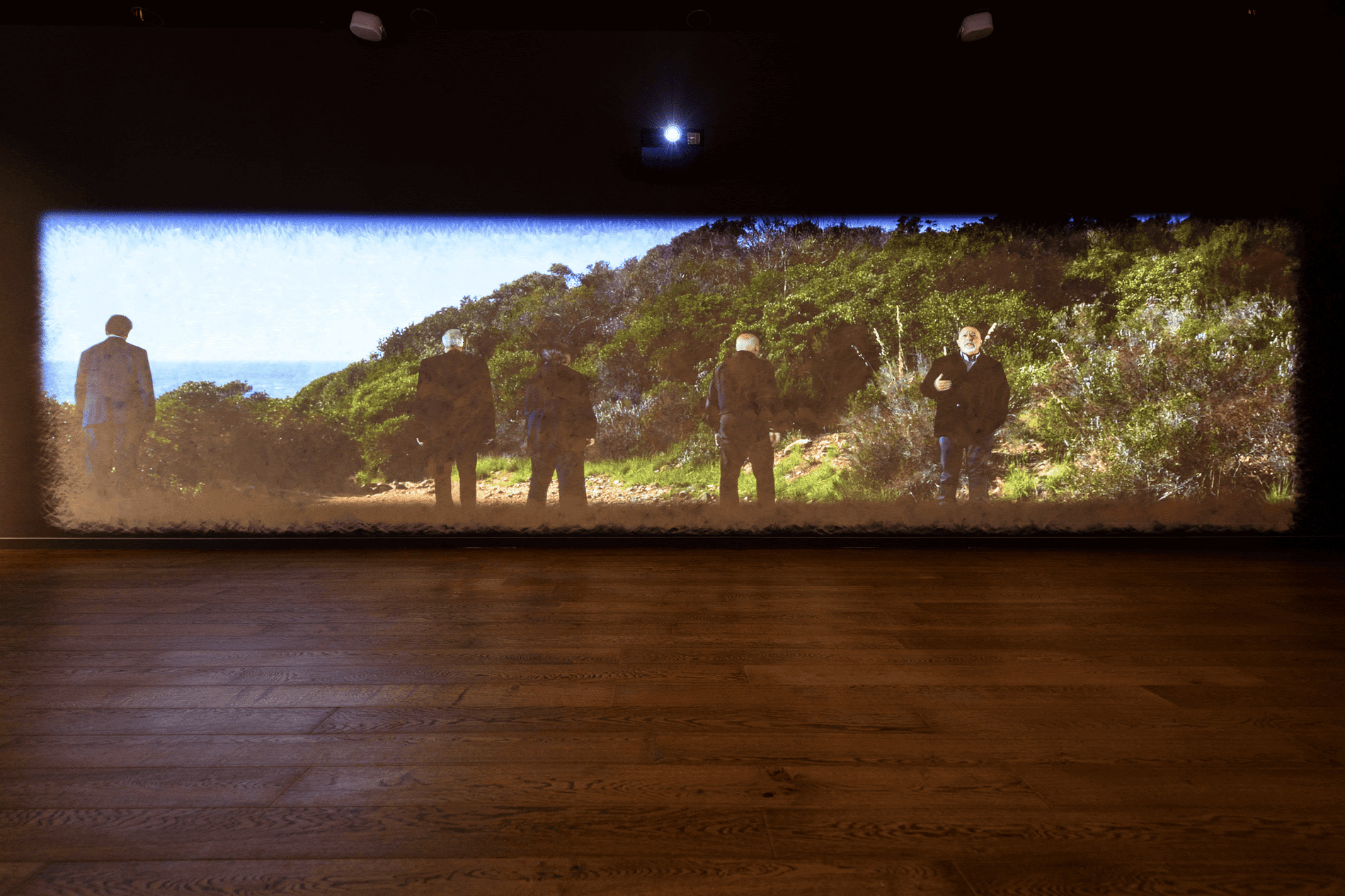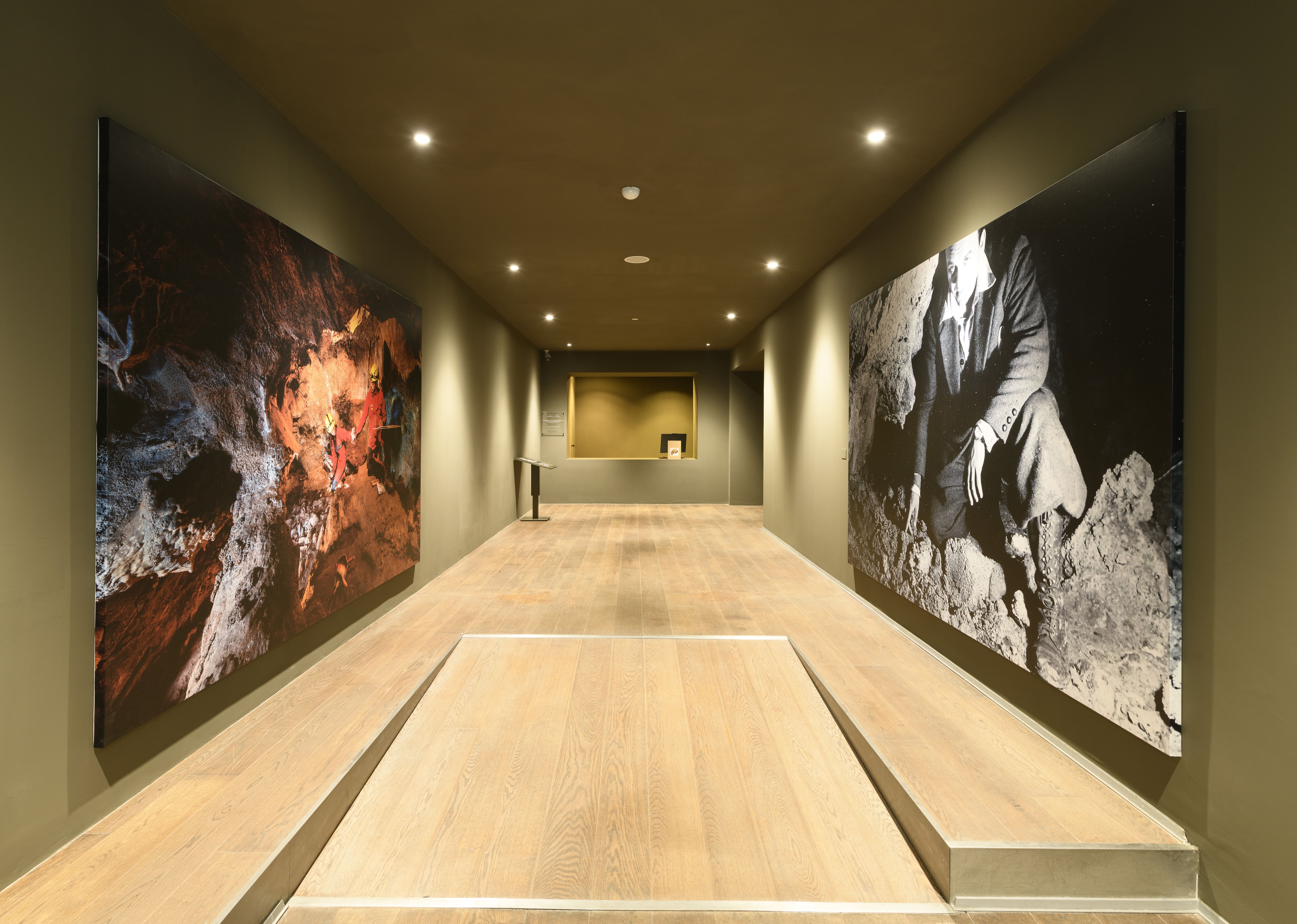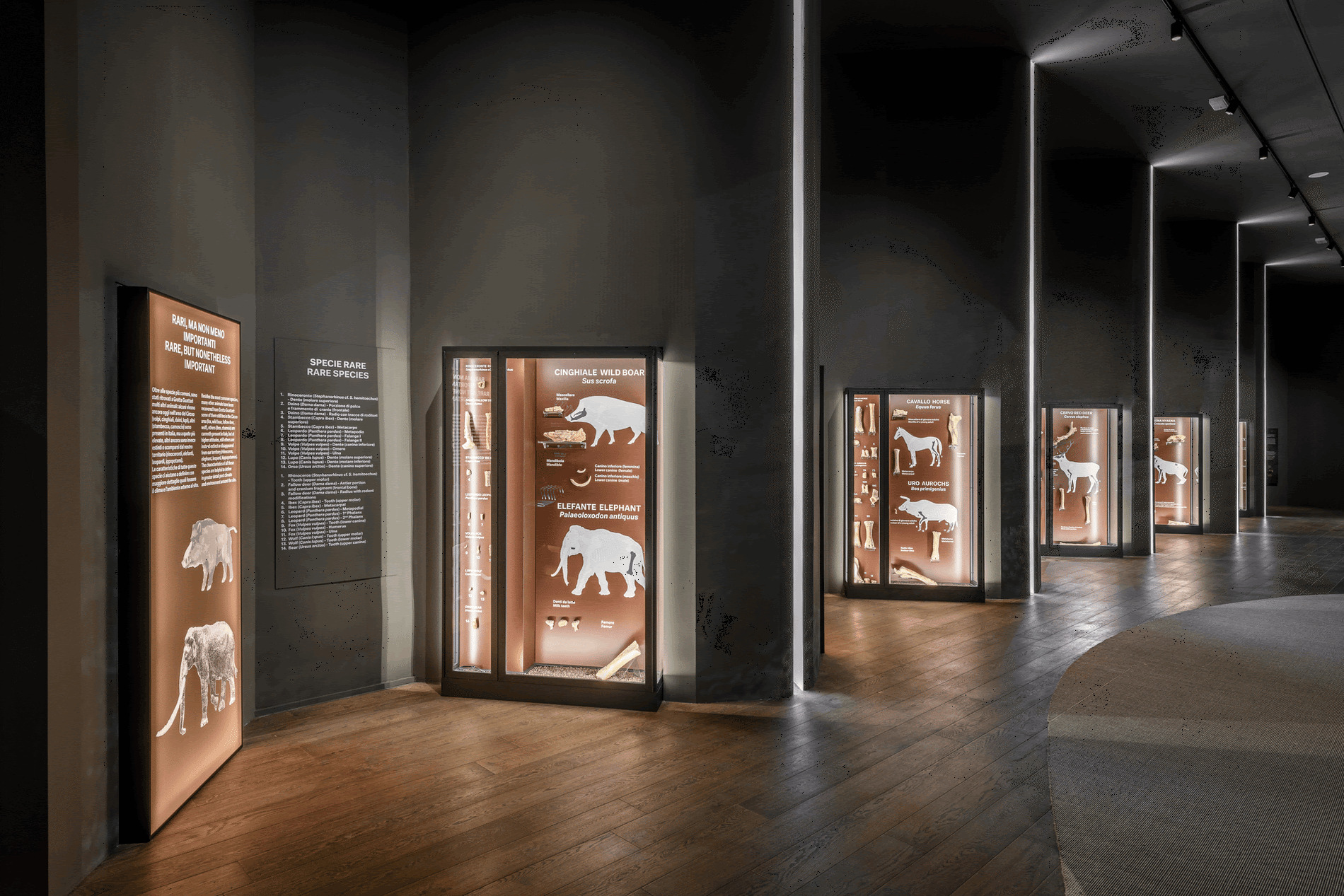 L’allestimento di Studio Azzurro evoca lo spazio ipogeo della grotta, pur evitando la ricostruzione mimetica. Ambienti scuri, fenditure luminose, superfici materiche e soluzioni di atmosfera accompagnano i visitatori in un’esperienza sensoriale che integra linguaggi visivi, sonori e interattivi. I reperti umani, faunistici e litici sono presentati attraverso vetrine integrate nelle pareti, postazioni multimediali, tavoli interattivi e dispositivi che consentono di ascoltare direttamente le voci dei ricercatori, rendendo accessibili anche i processi della ricerca scientifica.