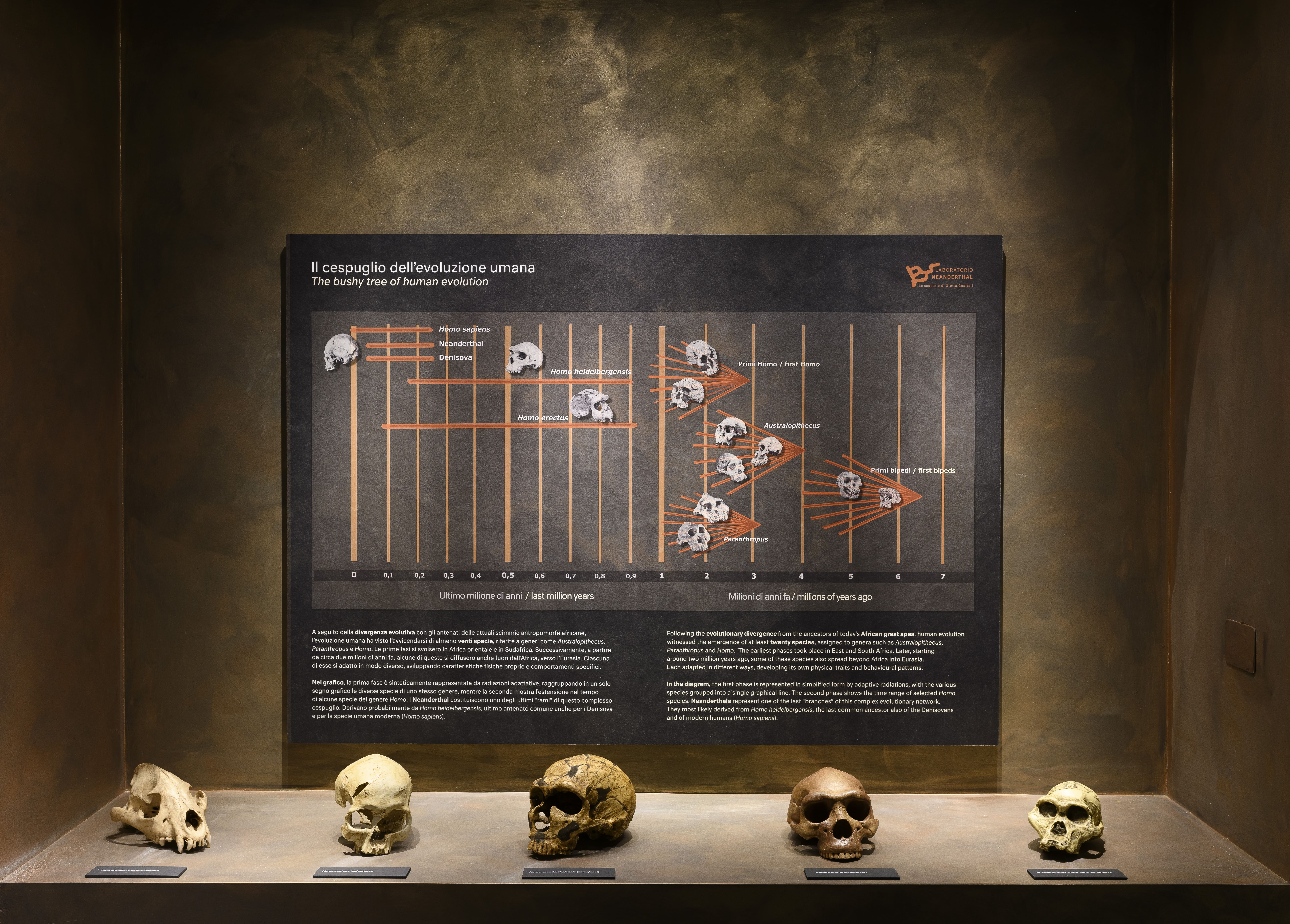 Il percorso vuole rendere una specifica visione dell’evoluzione, intesa come co-evoluzione multispecie, mettendo in evidenza le relazioni simbiotiche tra esseri umani, animali, ambiente e clima. In questa prospettiva, la storia dei Neanderthal, civiltà che convisse con l’Homo Sapiens ma che scomparve in un tempo relativamente breve, viene esposta come una narrazione apertissima, d’altra parte gli stessi studi scientifici sull’argomento sono tuttora vitalissimi. Ma a prescindere dal rapporto con i millenni passati, la questione è aperta ampiamente sul presente e la vicenda dell’Homo Neanderthalensis dialoga con questioni contemporanee, dal climate change all’intelligenza artificiale.