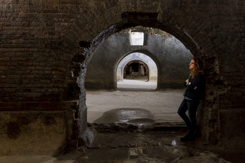 Le prime testimonianze moderne sulle Cisterne Romane risalgono alla fine del ‘500. Fu Gaetano De Minicis, a metà ‘800, a intuire che le stanze sotto il convento di San Domenico (sede del Museo Archeologico in costruzione) erano parte di una Piscina Epuratoria di epoca romana. Costruite – secondo le indicazioni inizialmente impartite da Vitruvio – tra il I secolo a.C e il I secolo d.C con lo scopo di conservare l’acqua potabile da distribuire in città, le Cisterne romane di Fermo sono tra le più antiche e grandi al mondo, sviluppandosi in 30 sale divise su tre file per un totale di 2.200 metri quadrati. Per molto tempo furono abbandonate e dimenticate, poi le cisterne furono parzialmente recuperate verso la fine dell’Ottocento, quando tornarono per circa un secolo all’originaria funzione di acquedotto cittadino. Profonde e invisibili, durante la seconda mondiale le Cisterne furono usate anche come rifugio, di cui sono testimonianza alcune frecce nere dipinte sui muri per facilitare l’uscita quando erano completamente al buio.