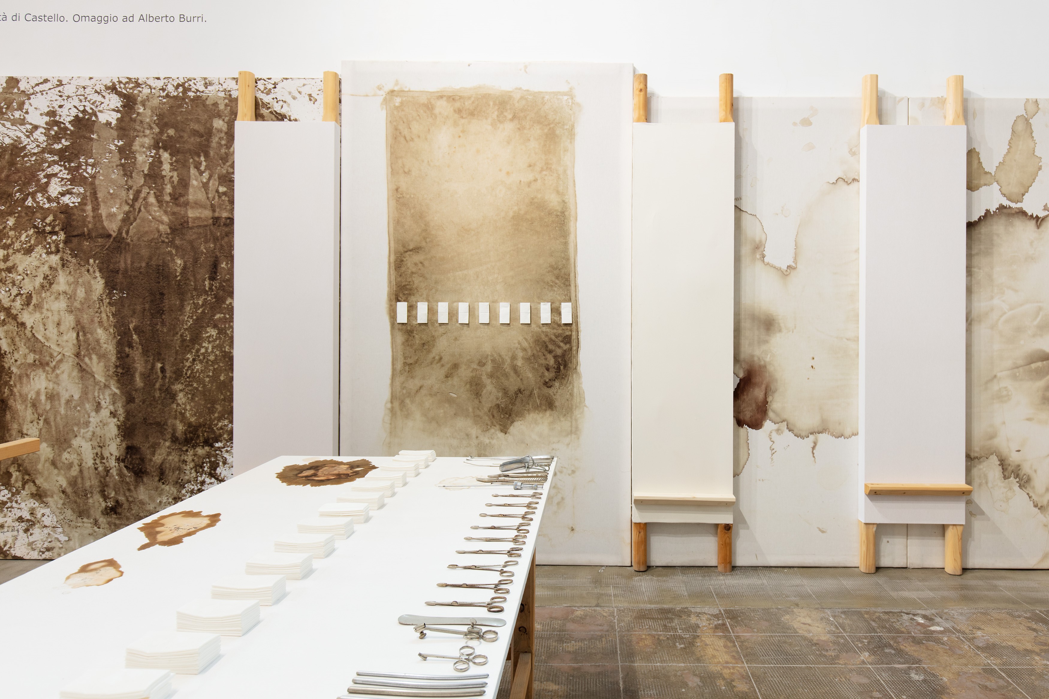 Sono le origini e gli esiti di questa pratica totalizzante, ciclica e a tratti paradossale, che Massimo Maiorino decostruisce, districando anche il serrato nodo del Gesamtkunstwerk (l’opera d’arte totale), sogno ossessivo di Hermann Nitsch, trovando nella teoria freudiana un innesco fondamentale che genera «Una messa in opera dell’inconscio come drammaturgia». Una nascita inevitabile — secondo lo stesso artista — quella dell’opera d’arte totale, ma dal compimento impossibile; visione di un mondo concepito sinesteticamente e irrimediabilmente intriso dalle azioni, che mediante il coinvolgimento e l’attivazione di tutti i sensi straborda nella vita reale, senza mai dissolvere, però, l’esistenza primaria e fondativa del linguaggio; un presupposto inviolabile riproposto da Massimo Maiorino a partire dalle avvertenze di Angelo Trimarco, tracciando uno spazio di contenimento compenetrabile, una membrana capace di avvolgere l’indomabile esperienza di Nitsch, «Artista e museologo totale», che in ogni eccedenza, «Non tracima il perimetro del linguaggio […] trovando nella pittura la forma, il sangue e la vita».