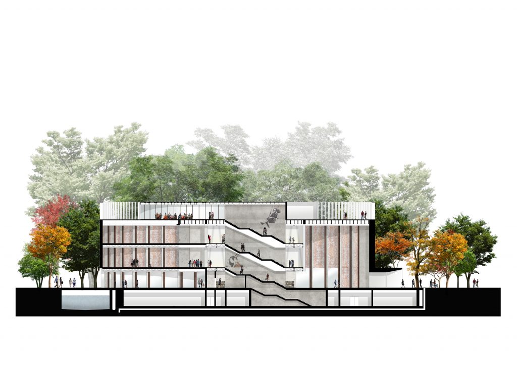 Uno scalone centrale porterà dall’ingresso del museo al primo e secondo livello, con la galleria per esposizioni temporanee, con pannellature modulari mobili per creare ambienti più o meno grandi e più o meno illuminati. Museo permanente e galleria temporanea potranno essere accessibili separatamente, per non ostacolare l’accesso alla collezione durante l’allestimento delle mostre. All’ultimo piano sarà ospitato un ristorante panoramico, accessibile dall’esterno anche quando il museo è chiuso, con una terrazza panoramica in copertura.