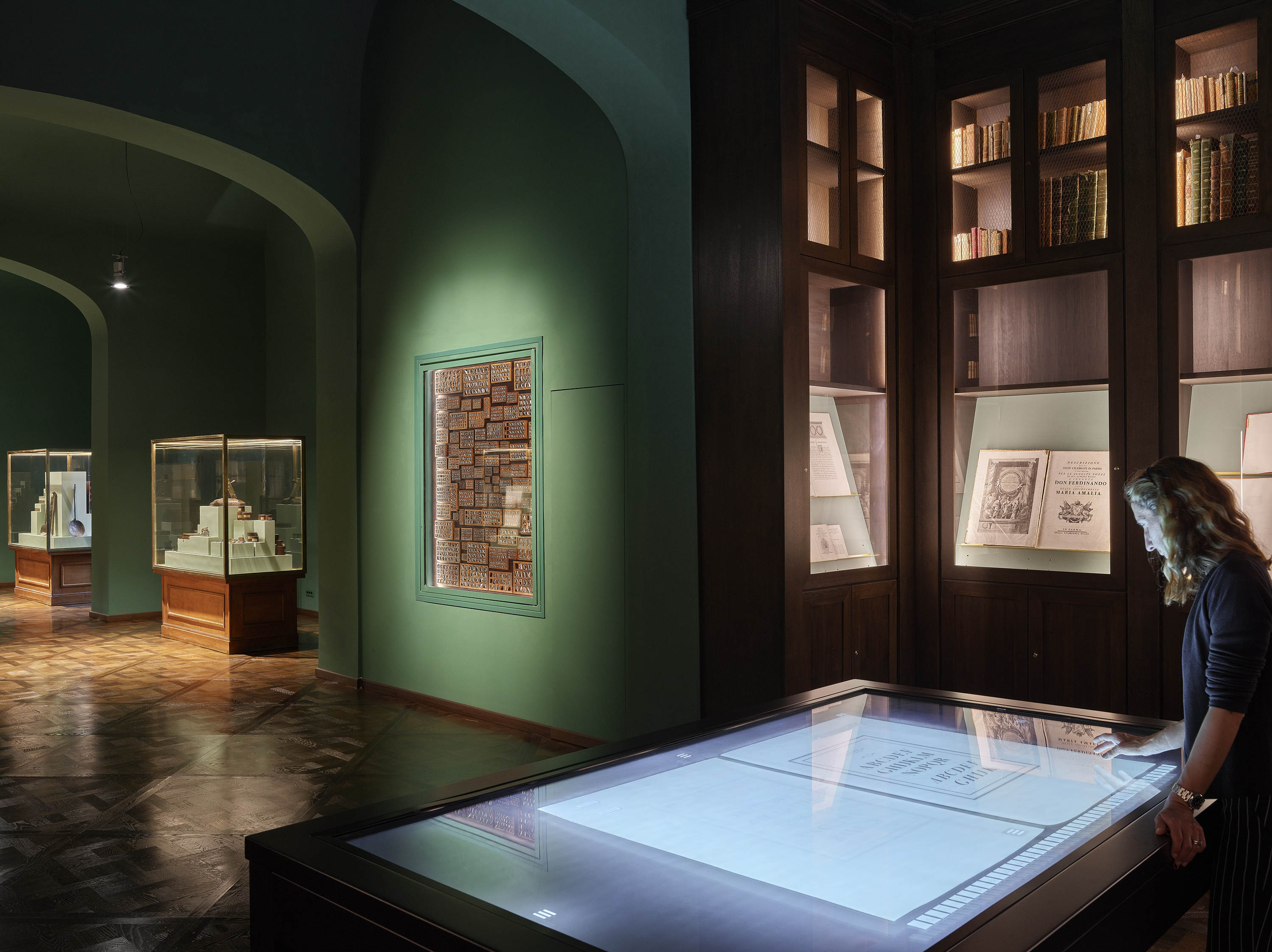 Al centro dello spazio, un tavolo multimediale e interattivo presenta, in formato digitale, diversi volumi fra cui il Manuale tipografico composto da cento caratteri latini tondi, 50 corsivi e 28 greci a cui Bodoni lavorò per tutta la vita, e l’immane opera dell’Oratio Dominica, il Padre nostro in 155 lingue utilizzando ben 215 caratteri diversi tra latini, greci ed esotici, stampato da Bodoni in meno di un anno. Grazie a tale dispositivo touch-screen è possibile effettuare una ricerca per volume e sfogliare le pagine dell’opera nella sua completezza, potendo così ammirare la raffinatezza e l’alta qualità del lavoro tipografico di Giambattista Bodoni.