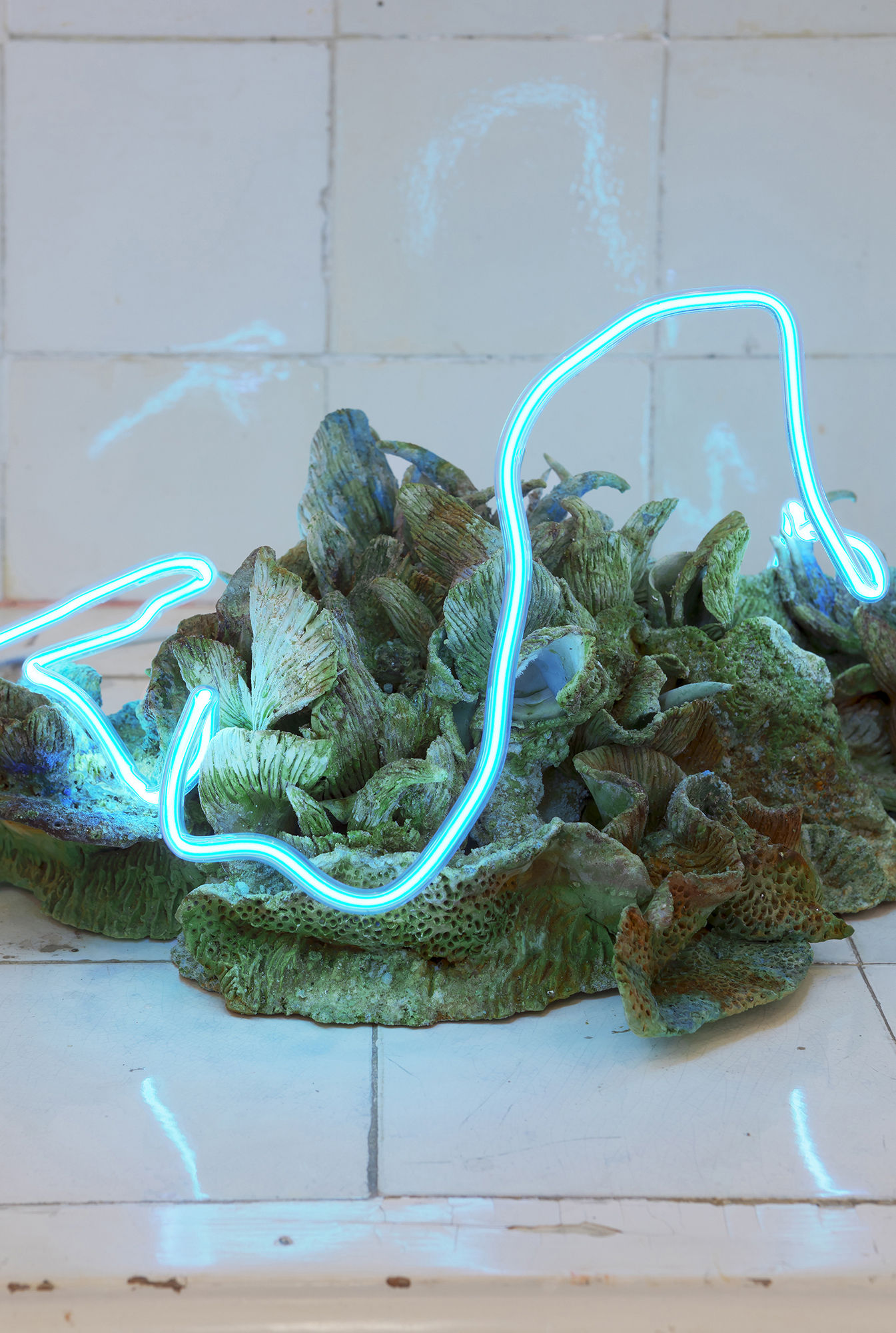 Silvia Mariotti, Anime di Cristallo, 2025. Ceramica, solfato di rame, polvere di ferro e alluminio, vari sali inorganici, neon (dettaglio)