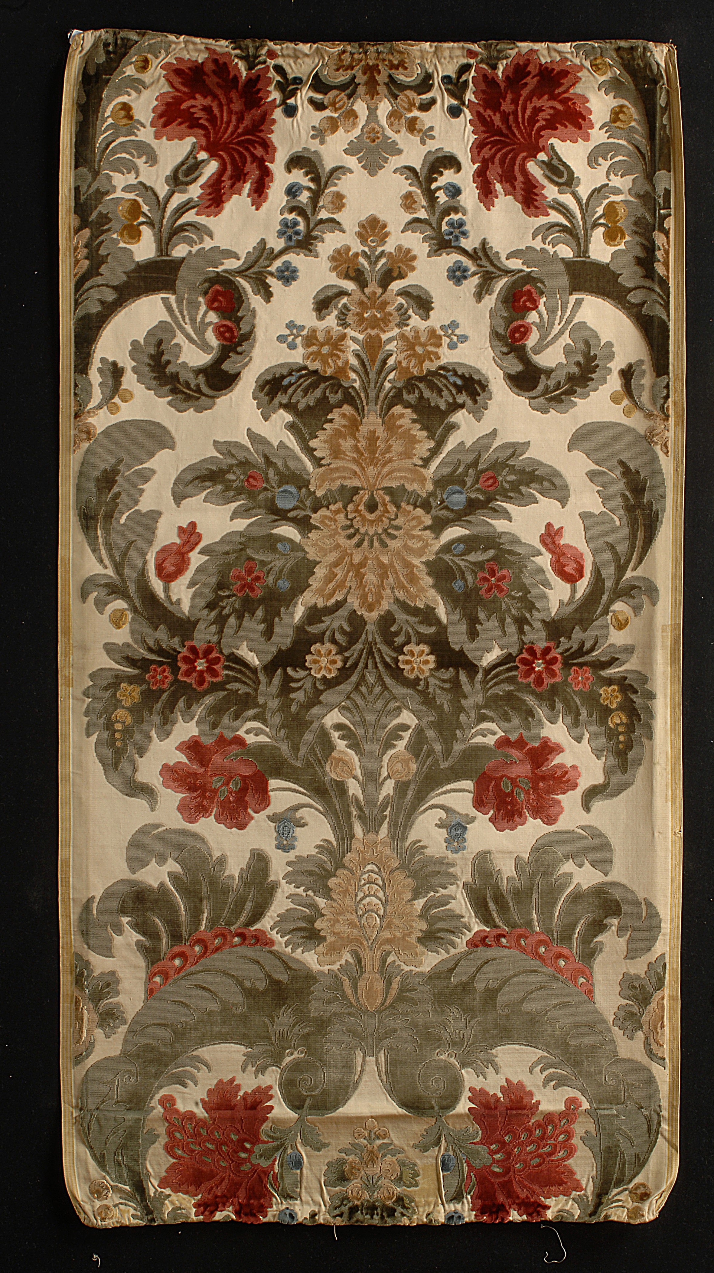 Tra i manufatti in esposizione nella Sala Tessuti di Palazzo Madama, anche due esemplari di velluti italiani operati, lavorati con filati d’oro e d’argento, i tessuti più richiesti da ogni corte del Rinascimento: un magnifico telo cremisi veneziano tagliato a due altezze, storicamente detto alto-basso, e un ampio frammento di velluto di seta rossa e oro, filato dal tipico disegno tardo quattrocentesco dei fiori di cardo, già parte di una veste liturgica.