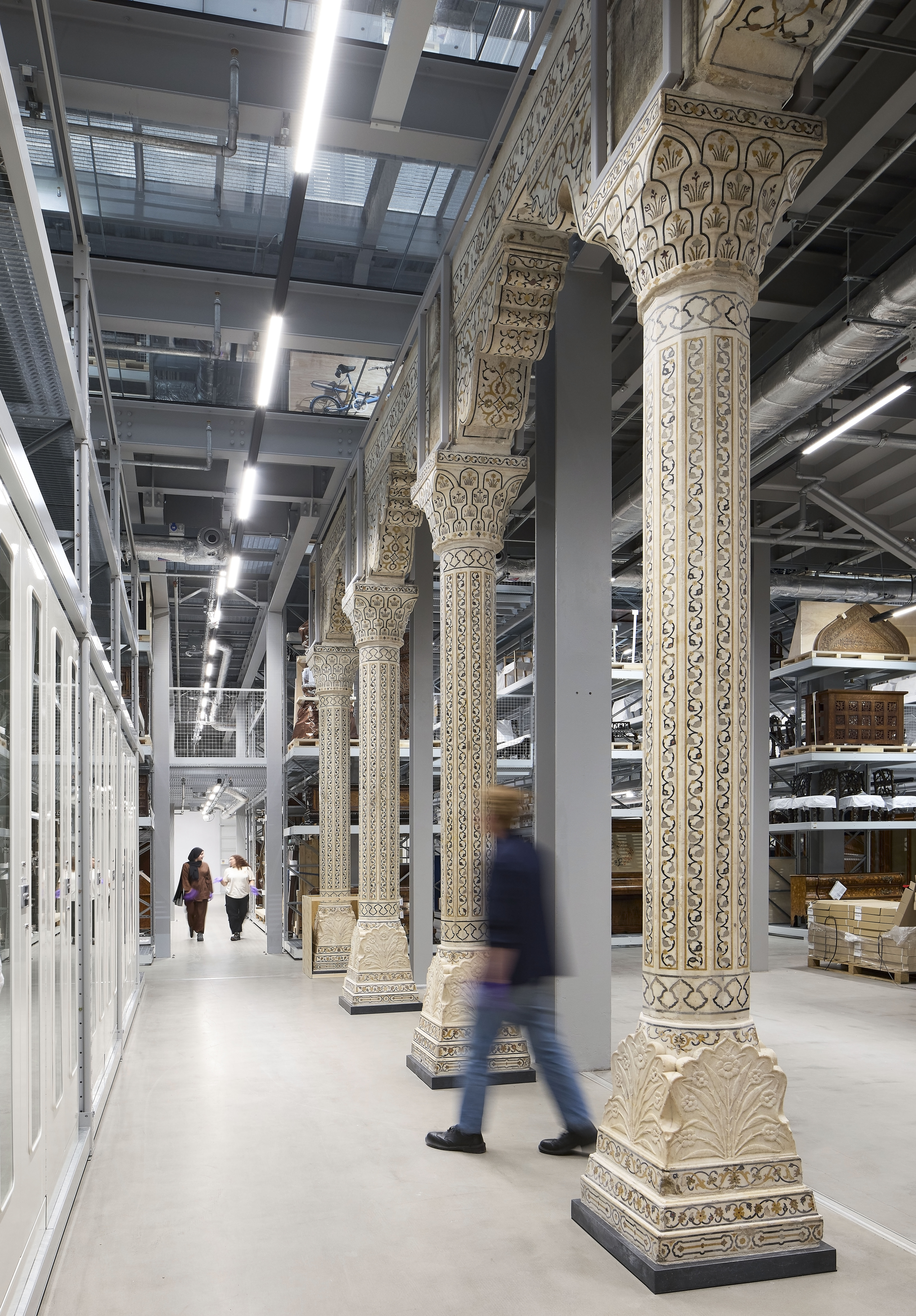 Il V&A East Storehouse si propone dunque come un museo in attività: quattro nuovi studi di conservazione, visibili attraverso vetri e connessi al pubblico tramite telecamere mobili e schermi, mostrano il lavoro quotidiano dei restauratori. La fotografia, la documentazione digitale, l’elaborazione dei nuovi arrivi, il prestito e il trasporto degli oggetti sono parte integrante dell’esperienza visitabile.