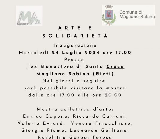 “ARTE E SOLIDARIETA’” è il titolo della mostra collettiva che l’Associazione Culturale Massenzio Arte inaugurerà come primo evento nel nuovo polo espositivo, presso gli spazi dell’ex Monastero di Santa Croce in Magliano Sabina (Rieti), in contemporanea con l’appuntamento estivo “Magliano Sabina Art in Festival”.