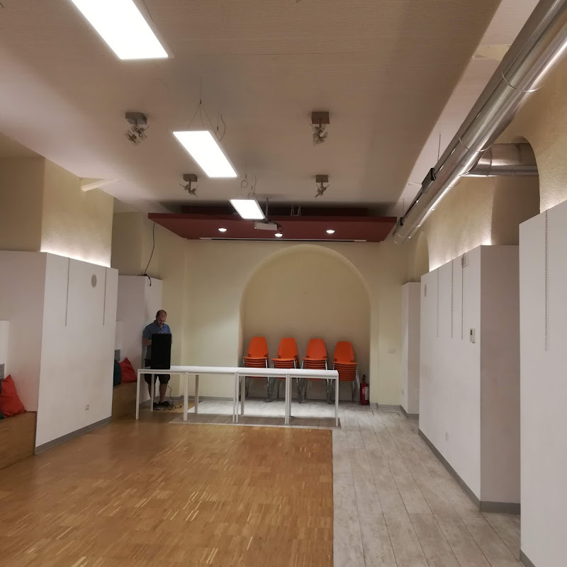 Galleria d’Arte con due sale espositive di 120 mq e ben strutturata con illuminazione diffusa e diretta. Può contenere tra le quindici e venti Opere d’Arte con grande schermo per proiezioni di docufilm. Ampio ingresso con cancellata. Capienza di circa cento persone. Agevole la possibilità di parcheggio