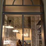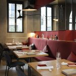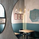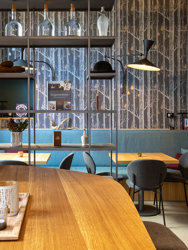 Interior minimal, ordinato, piacevolmente originale. Ogni singolo pezzo è stato realizzato su misura: i grandi specchi, il bancone in rovere naturale, i tavoli geometrici, le panche in stile nordico, angoli arricchiti da una wall paper che ricrea un bosco lituano; tutto per trasmettere piacevolezza e disinvolta eleganza, un luogo cool e al contempo accogliente.