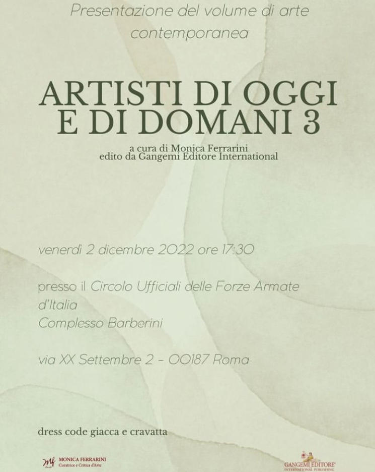 Il Circolo Ufficiali delle Forze Armate d’Italia, a Roma, nel comprensorio Barberini, presso la palazzina Savorgnan di Bratta’, ospiterà la presentazione del Volume “ Artisti di Oggi e di Domani 3 “, edito da Gangemi International , della Curatrice e Critica d’Arte Monica Ferrarini. Nel volume d’arte contemporanea di artisti internazionali, sono state inserite due opere dell’artista Marussa Giovinazzo. Il dipinto “ Lady Alfa – e la scultura A.I Artificial Intelligence.