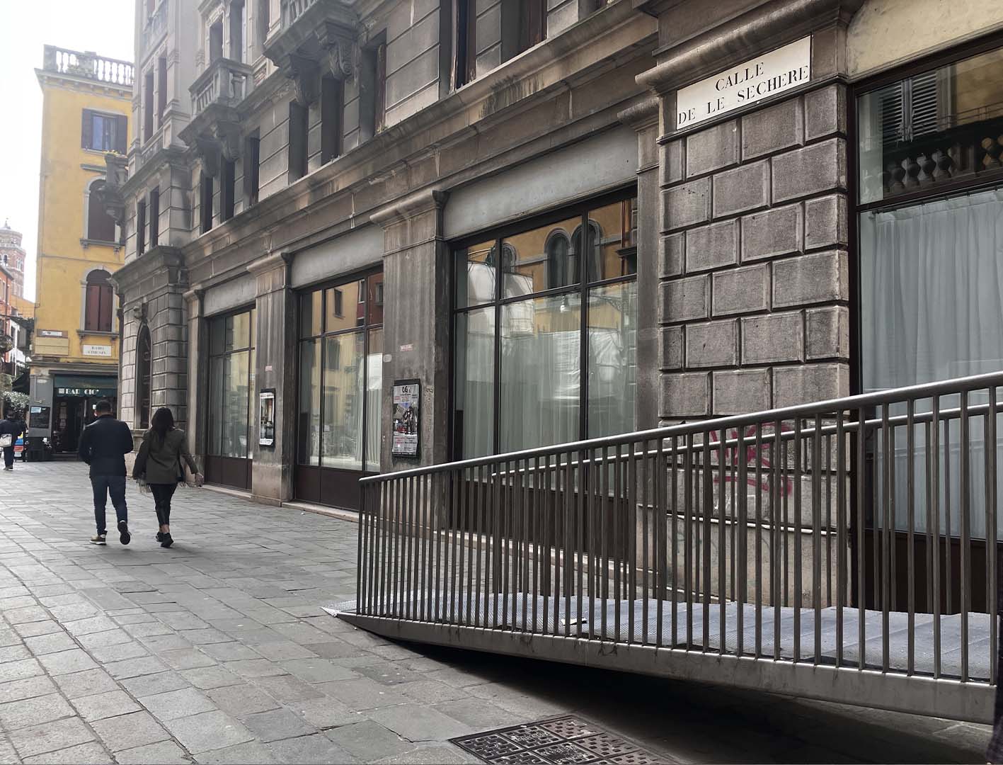 Quattro grandi vetrate, oltre i giardini Papadopoli, lungo il percorso che collega la stazione alla basilica dei Frari. Sono lo spazio espositivo di Domus Civica, studentato degli anni venti del Novecento a Venezia.