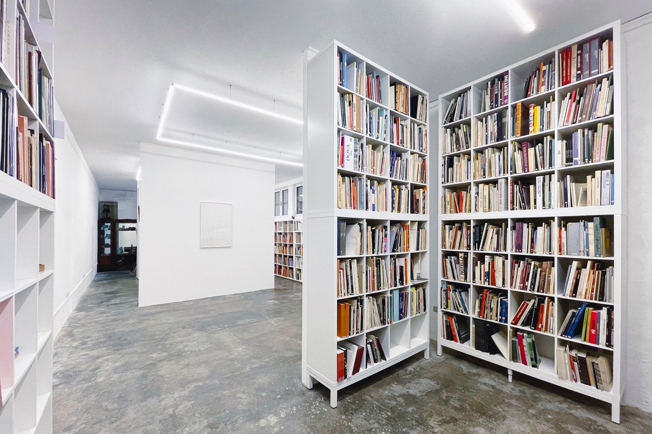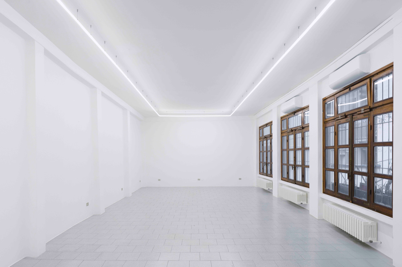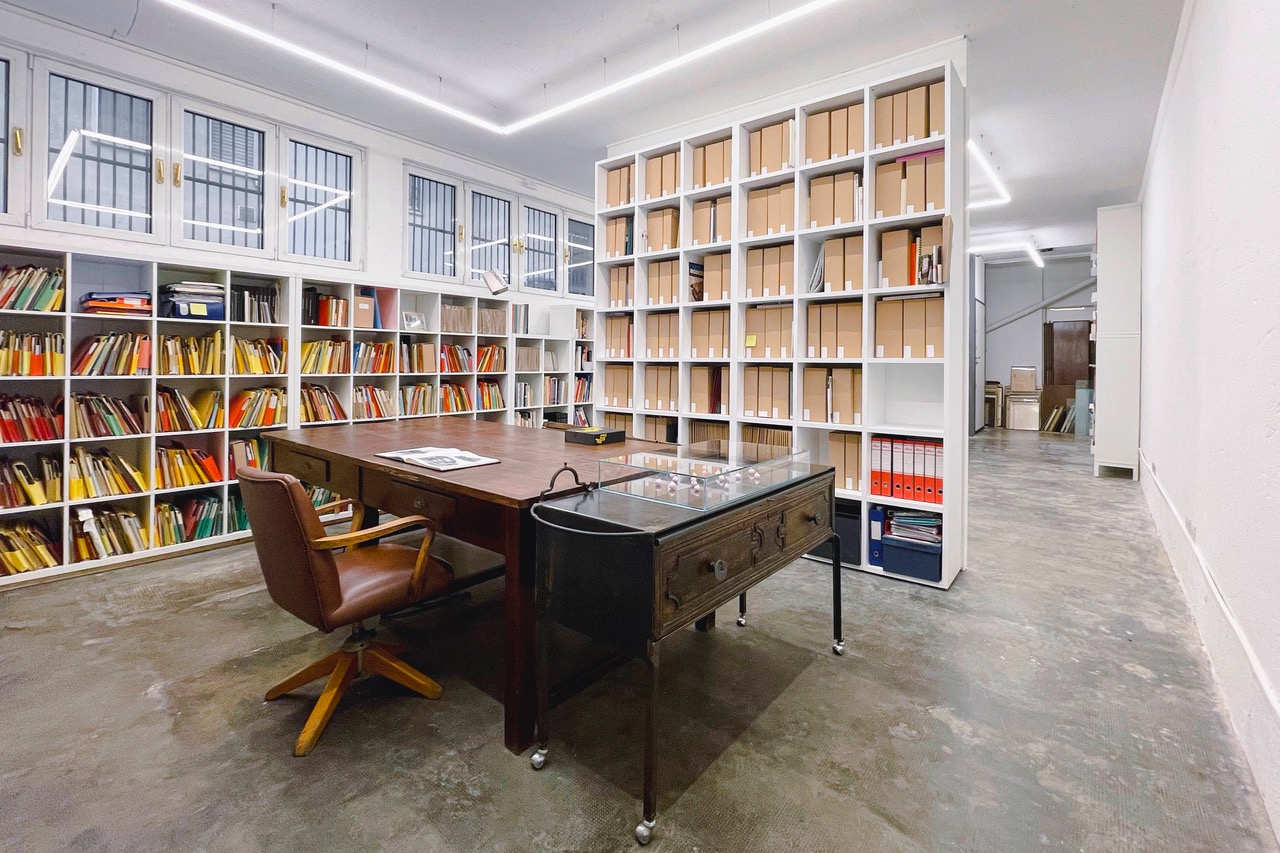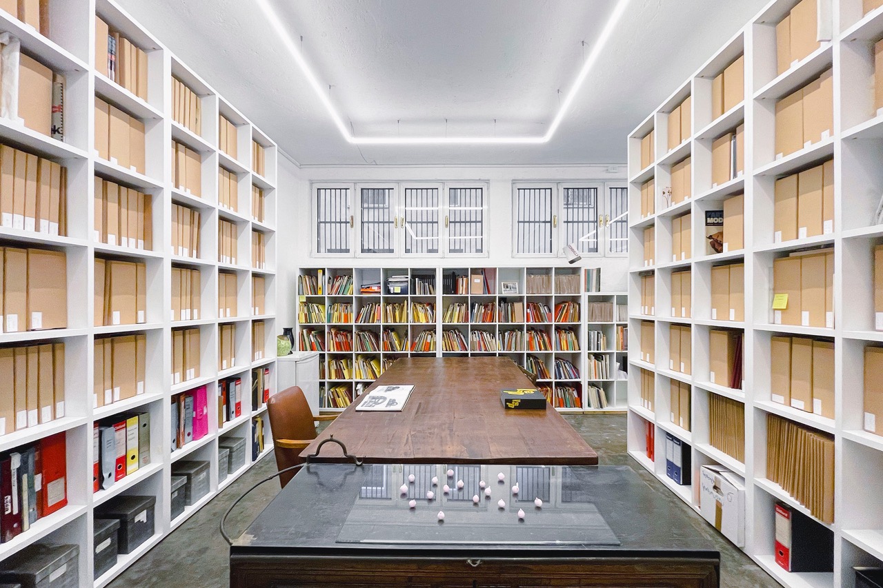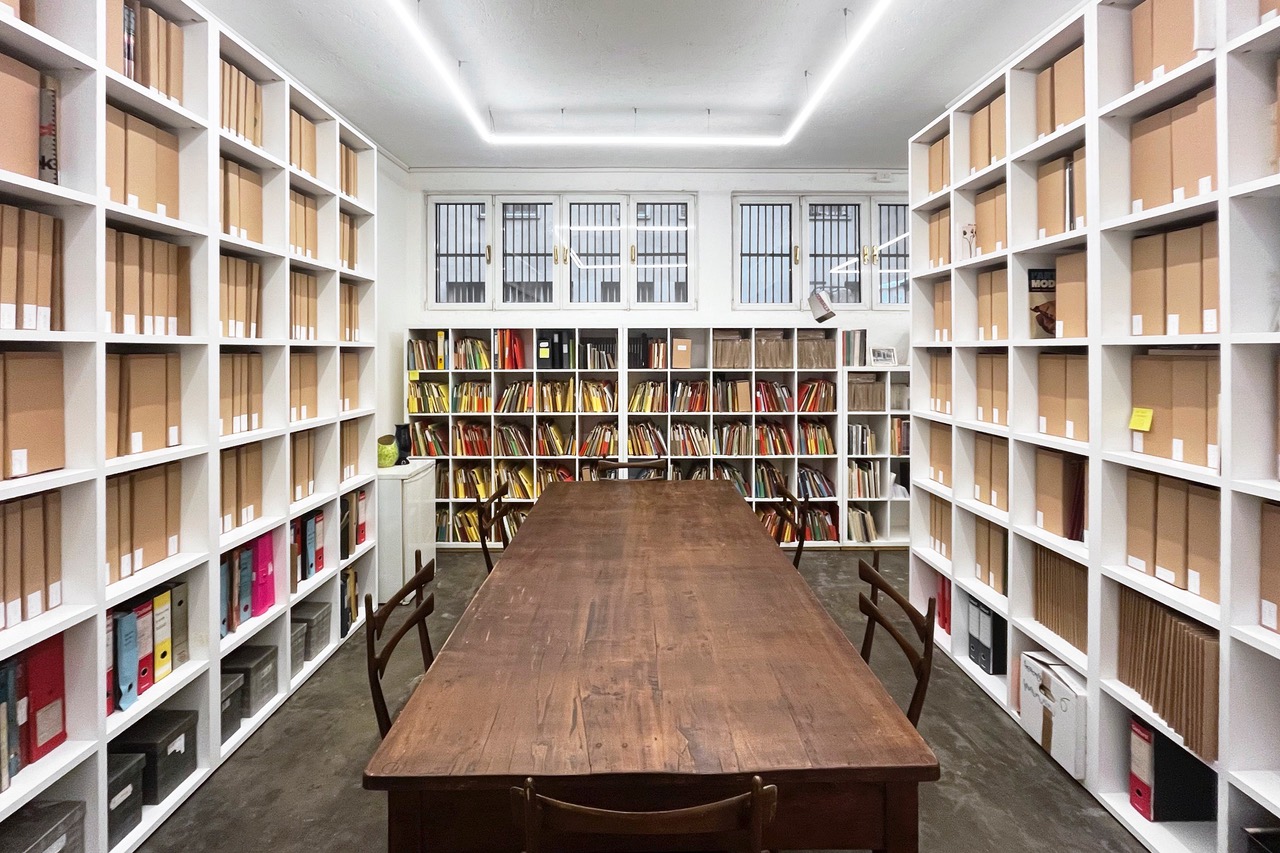Collocata in un cortile di un classico palazzo di Milano Sud, l’architettura su due piani ospita spazi espositivi, una vasta biblioteca e l’archivio.