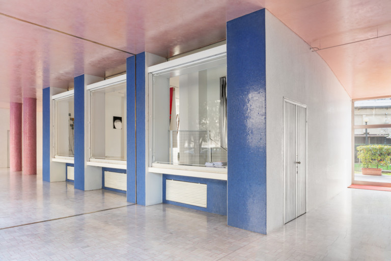 GALERA SAN SODA is a new contemporary art gallery based in Milan, Italy. The gallery was founded by Steno Branca di Romanico in 2018 as a last resort bunker for the promotion of art in a country plagued by an economic and cultural recession. Its core exhibition space consists of three large windows opening onto the salmon pink and blue tile foyer of Palazzo INA, designed in 1957 by the visionary rationalist architect Piero Bottoni at the height of the Italian postwar economic boom.