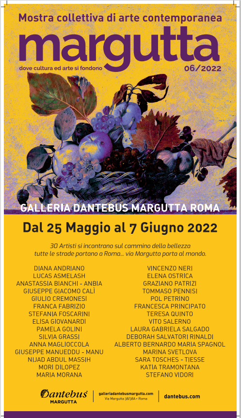“Margutta” è una collettiva d’arte contemporanea che si terrà a Roma dal 25 maggio al 7 giugno 2022 presso la prestigiosa Galleria Dantebus Margutta di via Margutta, 38.