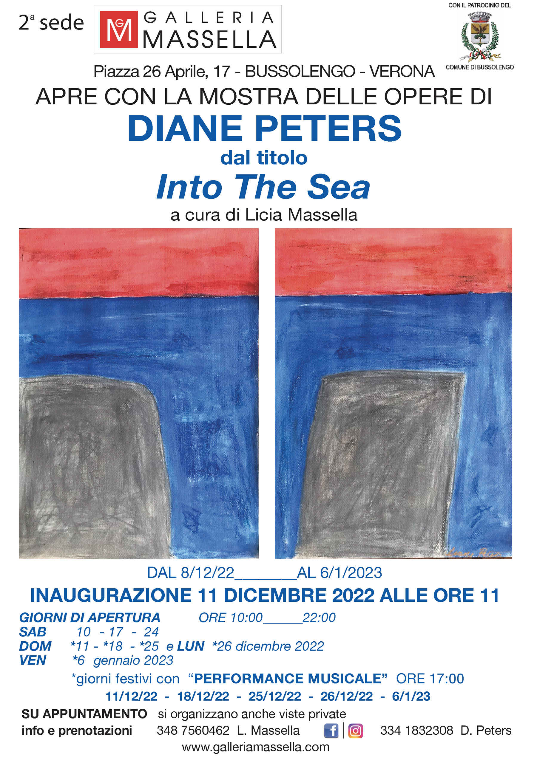Galleria Massella APS, associazione di promozione culturale e sociale, apre la seconda sede a Bussolengo VR in Piazza 26 aprile, 17, con la mostra di Diane Peters dal titolo “Into the sea”, patrocinata dal Comune, domenica 11 dicembre 2022 alle ore 11.