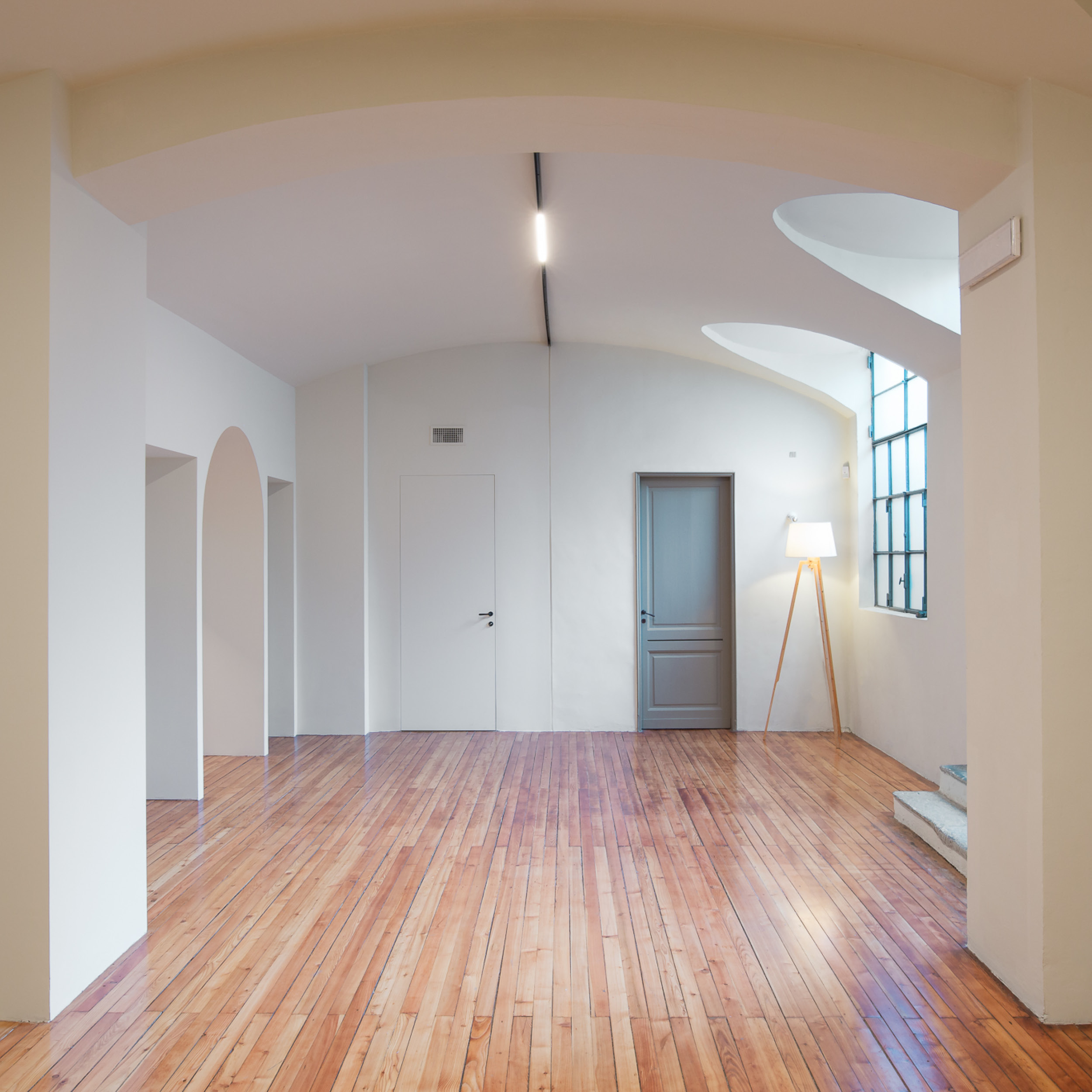 A guardare le immagini tutto si direbbe tranne che il luogo sia sotto il livello della strada: Lo Spazio è un laboratorio-atelier, spazio di esposizione e co-working ricavato da un ex magazzino nel tipico piano seminterrato di una casa.