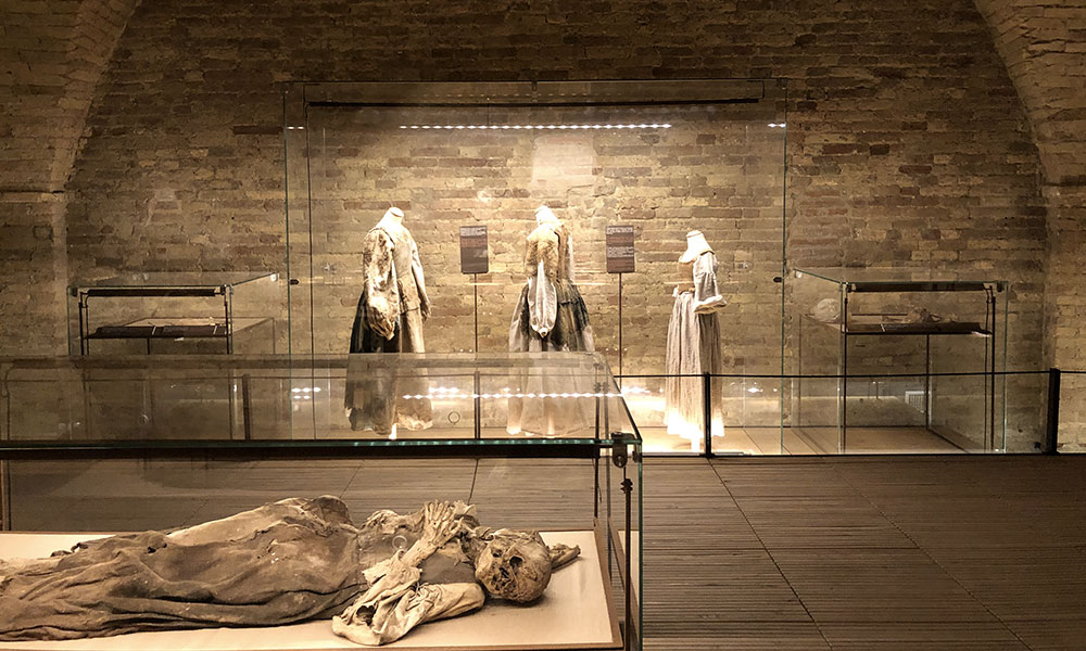 Nel 2003 durante lavori di restauro nella Cripta della Chiesa di Maria SS. Assunta sono stati portati alla luce oltre 20 corpi umani mummificati. IIn questi suggestivi spazi è stato allestito il Museo della Cripta – le Mummie di Monsampolo dove si possono osservare oltre ai corpi mummificati, gli abiti, i tessuti, i rosari, le medaglie, gli anelli e tutti gli oggetti rinvenuti durante lo scavo archeologico.