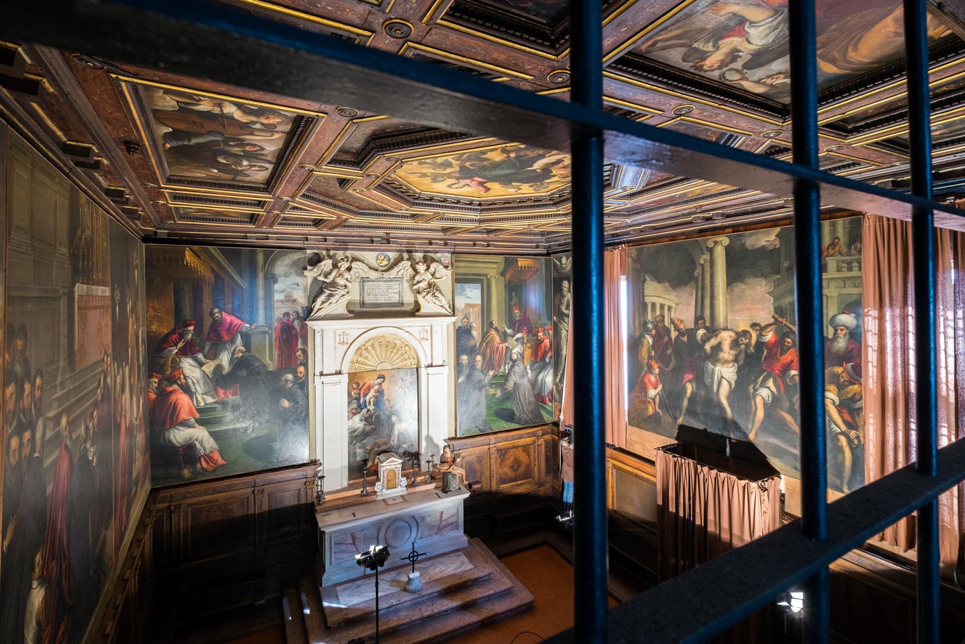 Situato sul lato sinistro del Campo dei Gesuiti, l’Oratorio fa parte integrante di un edificio medievale dalla semplice struttura a capanna – l’ospizio Renier Zen – fondato nel XII secolo dall’ordine religioso dei padri Crociferi e destinato a ospedale e a luogo di ristoro di pellegrini e di crociati. L’Oratorio ospita il ciclo pittorico di Jacopo Palma il Giovane, eseguito alla fine del ‘500 e ricopre per intero le pareti e il soffitto. (courtesy F.ne Venezia Servizi alla Persona)