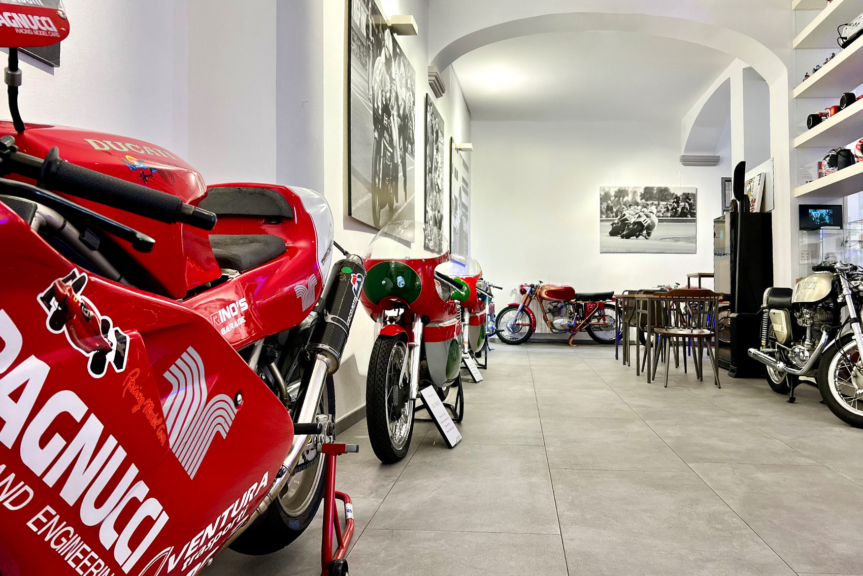 Lo spazio ospita una collezione privata di moto Ducati con Winebar a Bologna. Con spazio espositivo di due piani aperto alle esposizioni artistiche. In memoria di Rino Caracchi.