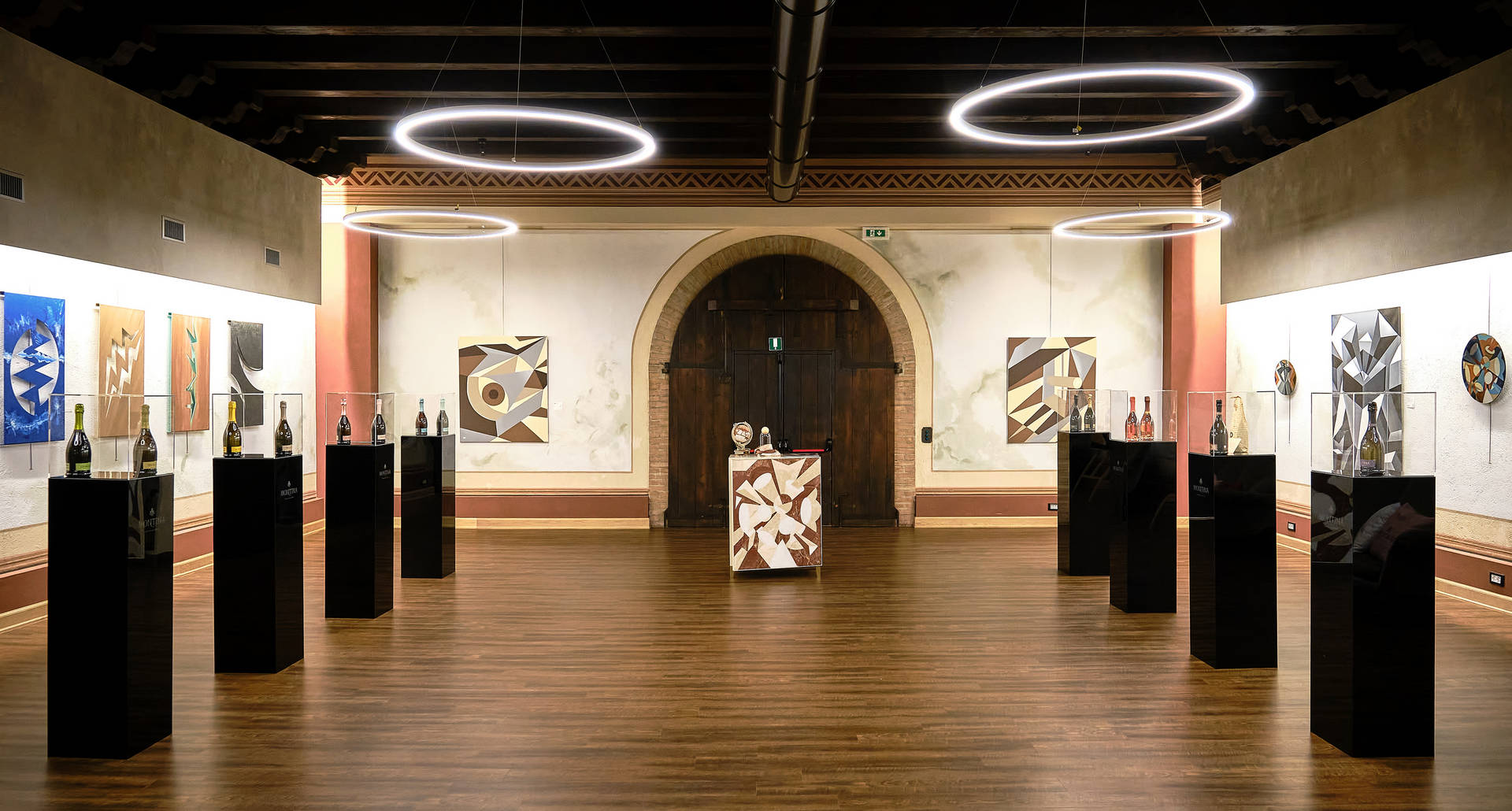 Ciclicamente la galleria ospita personali di artisti contemporanei nazionali ed internazionali, le cui opere vengono fatte vivere nell’inimitabile percorso museale che si snoda tra sale maestose, cantine, botti e bottiglie che riposano sui lieviti.