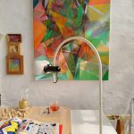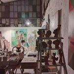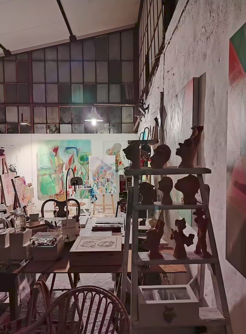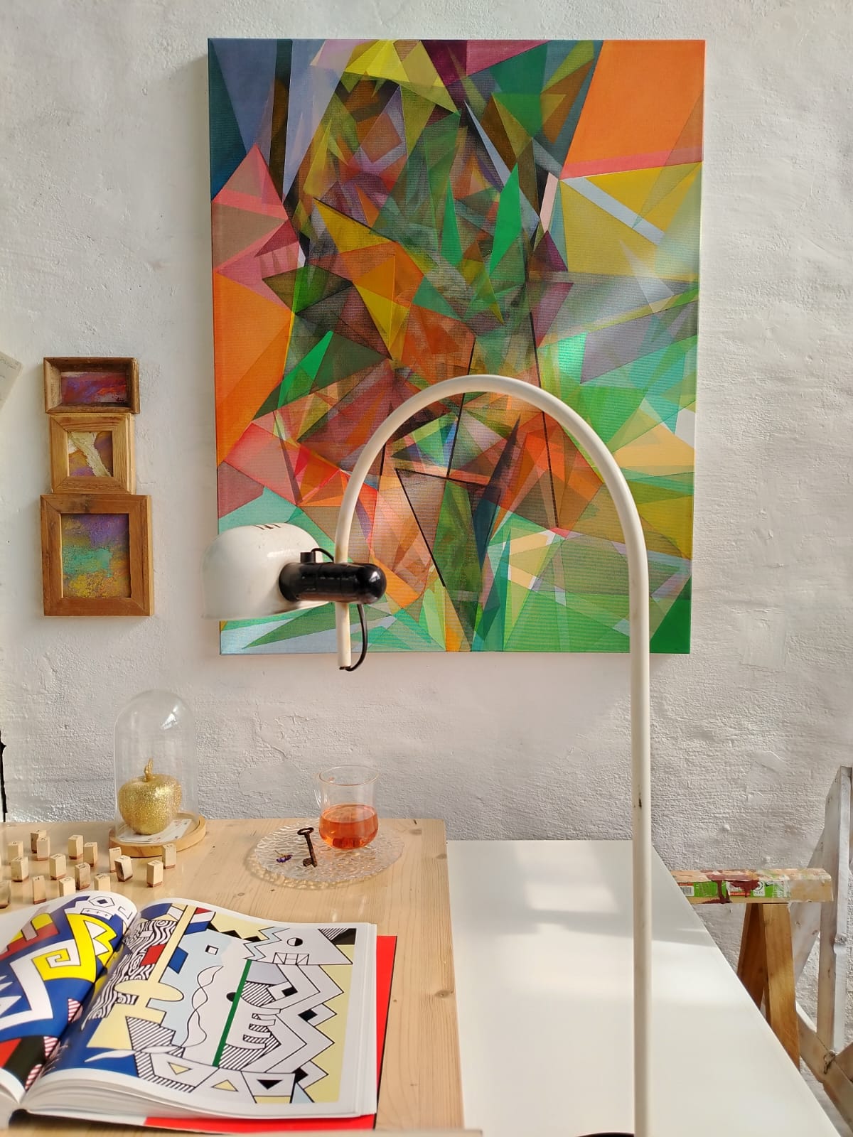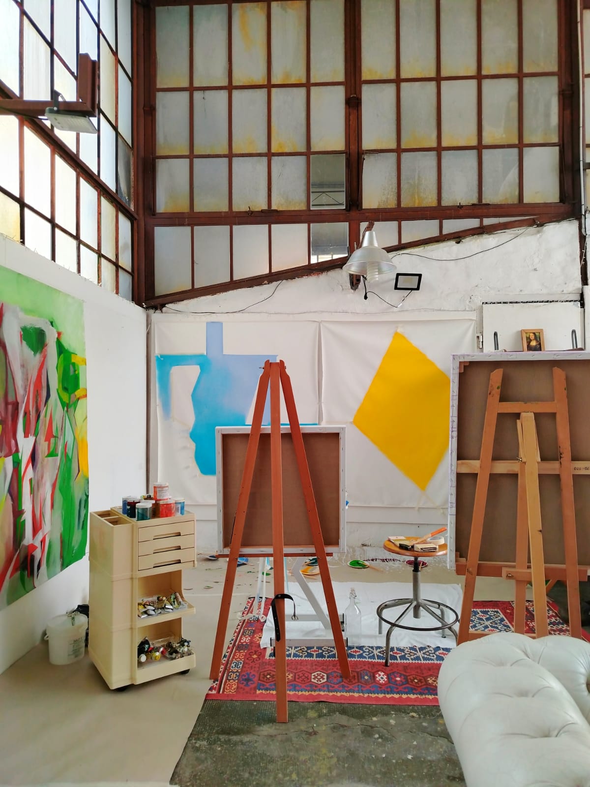 Il mio studio è uno spazio condiviso con un’altra pittrice ed è un un atelier molto grande, caratterizzato da un’estetica industriale. L’ambiente è dominato da una grande vetrata a nido d’ape, che suggerisce un’abbondante illuminazione naturale, ideale per la pittura.