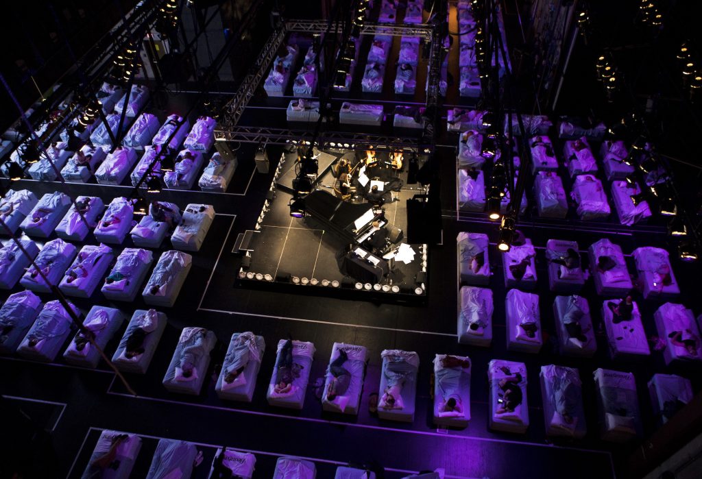 Sleep è stata registrata nella notte del 26 settembre 2015, nella Reading Room della Welcome Collection di Londra, con Max Richter al pianoforte e all’elettronica, il soprano Grace Davidson e cinque suonatori d’archi. In quella occasione, il pubblico è stato incoraggiato a sdraiarsi sui letti e a dormire durante l’esibizione. L’opera, originariamente pensata come «Ninna nanna per un mondo frenetico», oggi acquista una intonazione diversa e inaspettata, che ognuno, nel proprio ascolto, potrà seguire e lentamente abbandonare, lungo le ore silenziose tra un silenzioso giorno e l’altro. In Italia, la performance sarà trasmessa da Radio Rai3.