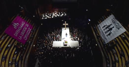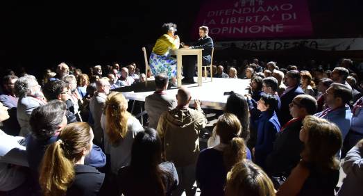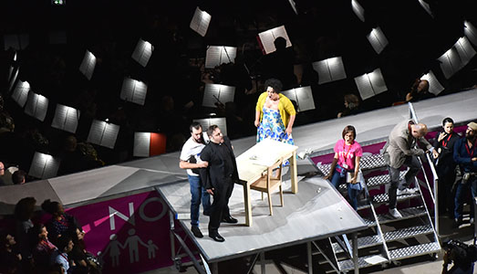 Alleggerita dai lenzuoloni stesi sulle gradinate del ligeno teatro e che enunciano proclami contrapposti gli uni agli altri (“Difendiamo la famiglia”, “L’utero e mio” etc.), e liberata da vecchi automatismi pseudoscandalistici (ma qualche “bianco-anglosassone-puritano” in abito da sera che guarda uno svolazzar di tette isteriche, l’abbraccio gay e il bacio saffico tra il falso disdegno e l’allupato lo trovi sempre), la regia di Vick è strepitosa, semplice e disarmante come a volte può esserlo un colpo di genio: collocare in platea non solo l’orchestra (del Comunale di Bologna, sul podio Guillermo García Calvo), non solo il pubblico, ma un pubblico in piedi, itinerante insieme con le strutture mobili su cui sono situati i cantanti solisti e con loro gli arredi scenici. Personale addestrato li muove, li unisce, li allontana durante l’azione, rendendo il tutto coinvolgente. Quando Stiffelio legge pubblicamente l’episodio biblico dell’adultera, lasciando in questo modo intendere il perdono per la moglie Lina con un gesto che è al tempo stesso privato e pubblico, si alza un coro che intona il Miserere, un coro che, ascoltato come d’abitudine da platea, palchi o loggione di un teatro all’italiana può essere sentito con una certa partecipazione, ma che, se vissuto trovandosi i coristi a cantare al tuo fianco nella “vasca” del Farnese (ottimo lavoro di Andrea Faidutti), tutti insieme mischiati con figuranti, discepoli e popolo, posso assicurare che ti viene la pelle d’oca. Durante lo svolgersi dell’azione su una scena che è anche la scena degli stessi spettatori di una singolare transumanza che li rende co-attori della messa in scena – più che mai qui vale l’espressione mise en espace -, s’incrociano gli sguardi ora smarriti, ora ammaliati, ora eccitati di comuni spettatori come quelli soddisfatti di colleghi musicisti e direttori artistici. Un pubblico che forse mai come in quest’occasione si deve esser sentito tanto fisicamente vicino alla voce e alla storia dei cantanti, situati sulle strutture mobili a un metro e mezzo di altezza. Un cast al quale pure si deve il successo dell’operazione: su tutti il soprano Maria Katzarava, una Lina di straordinaria fattura vocale e sostanza drammatica, ma anche Luciano Ganci per Stiffelio, Francesco Landolfi per Stankar, il padre di lei, Giovanni Sala per l’amante Raffaele. L’accoglienza tiepida delle prime rappresentazioni di quest’opera spinse Verdi a rivederla dandole un nuovo titolo (Aroldo); ma è ormai, e giustamente, Stiffelio a meritarsi il repertorio, e con esso anche letture originali come quella proposta da Graham Vick. E, come a Parma, caldissimo successo di pubblico.