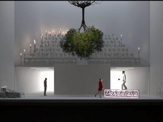 Formalmente Michieletto la risolve sottolineando una certa frammentarietà, tipicamente berlioziana, della partitura musicale, circoscrivendo il racconto (immaginato più che conseguentemente proposto dallo stesso Berlioz) in tableaux con tanto di numerazione e titolazione, soluzione resa in modo elegante, anche se didascalica. Si diceva, la proposta non prescinde dall´idea di un rapportarsi con il mezzo visivo, (video, internet, social) come unico drammatico interlocutore di una realtà virtuale, e basata sul fallimento della comunicazione diretta, fisica. Originale in questo senso la scelta di accompagnare l´ascolto della celebre Marcia di Rákóczy, ossia la scampagnata di Faust in terra ungherese, con una forte scena di bullismo che Faust immagina di (ri)vivere, con tanto di ripresa da parte degli aggressori attraverso il proprio telefonino. Lo scarto poi con la scena d´amore, nella terza parte, scena prontamente interrotta da Mefistofele sul piu bello, ambientata in un contesto completamente differente, floreale, del giardino creato da Mefistofele per i due amanti (qui il regista ci dice di far riferimento alla pittura di Lucas Cranach il Vecchio), con, aggiunta l´insegna di un Motel Paradise, crea uno scarto forte e fortemente voluto, anche in questo caso teatralmente assai efficace. Il coro nella Damnation non interloquisce come personaggio, ma commenta, e non a caso viene collocato in posizione estranea, sopra la scena, opacizzato da un tulle scuro fino all´illuminazione calda dell’apoteosi finale, dove si rivela pienamente.