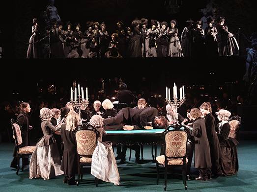 Bertman è regista talentuoso, ma è anche un vero lavoratore della direzione teatrale, e non smette mai di ricercare, di individuare nuove possibili letture. Prova ne sia il fatto che questa Dama è completamente diversa da una precedente vista anni fa in quel di Ravenna, in occasione di una delle non infrequenti ospitalità italiane di questo teatro moscovita. Bellissimo il colpo d’occhio: scena in primo piano, arredata con un elegante tavolo verde da gioco, e orchestra sul retro: un ribaltamento rispetto alla posizione tradizionale esaltato nella specifica collocazione anche da un sapiente gioco di luci. L’impianto registico è assai dinamico e non privo di effetti cinematografici, come la presenza di uno specchio in scena, inquietante solo per la sua collocazione, laterale, di nome e di fatto sinistra, laddove, forse alludendo di lontano al wildiano Dorian Gray, gioca sul ritratto deformato della donna del titolo, e che ha dell’agghiacciante nel finale. Nella scena della morte improvvisa della Contessa traspare un’ambigua, fatale liaison fra Herman e la stessa Contessa, rapporto che porta all’estremo la già forte attrazione segnata dalla pulsione ludopatica. Una forzatura, forse, che tuttavia sembra di scorgere già nella “tinta” (avrebbe detto Verdi) quasi lugubre della partitura ciajkovskijana. In definitiva, uno spettacolo affascinante, che non lascia indifferenti e che, visto nella sala dove è nato, assume ulteriore autenticità, un po’ come certo vino che, bevuto nel luogo dove è stato prodotto, ha un retrogusto differente dallo stesso comprato al supermercato.