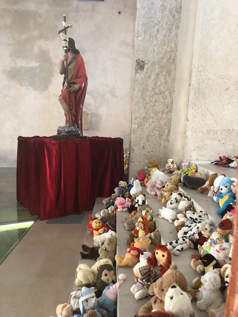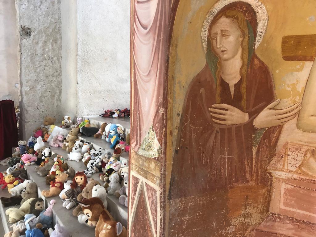 L’elemento del pianoforte, per esempio, posto all‘interno della navata centrale e dialogante con il grande pulpito trecentesco, si anima grazie a una serie di inconsuete presenze che occupano e inondano tutto lo spazio fisico dell’edificio, dando nuova forma a quel cosmo. Questi ultimi non devono essere assolutamente considerati come elementi decorativi ma, piuttosto, come delle divinità che rigenerano l’ambiente selezionato dall’artista.