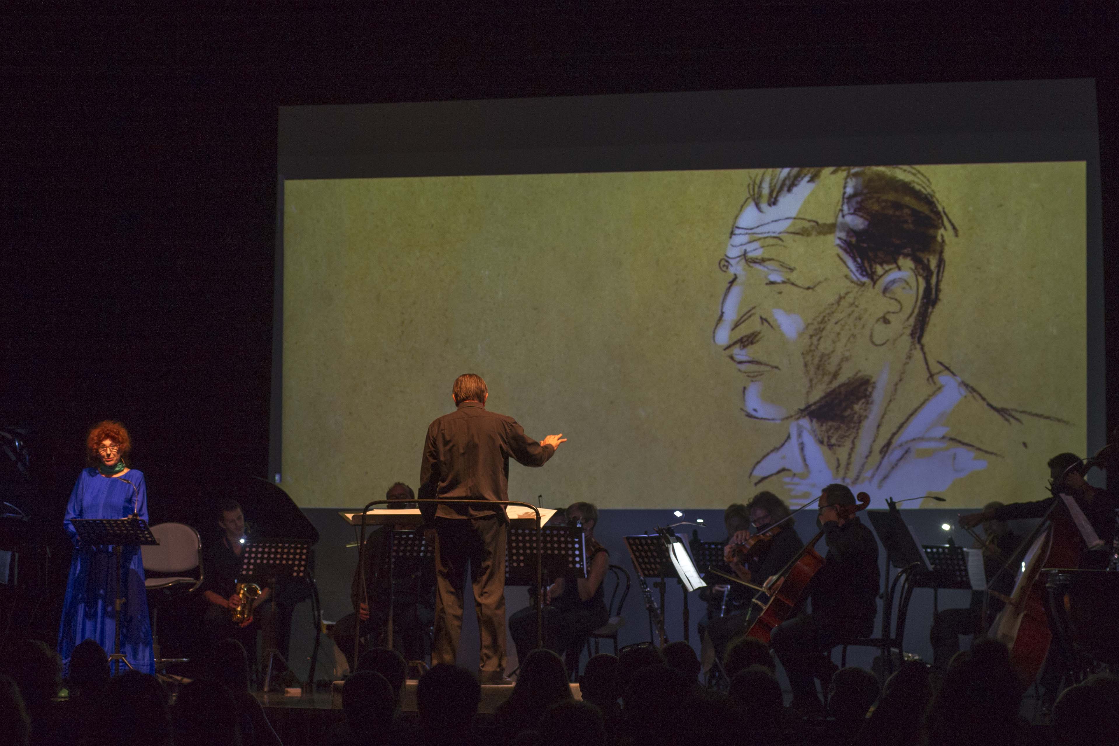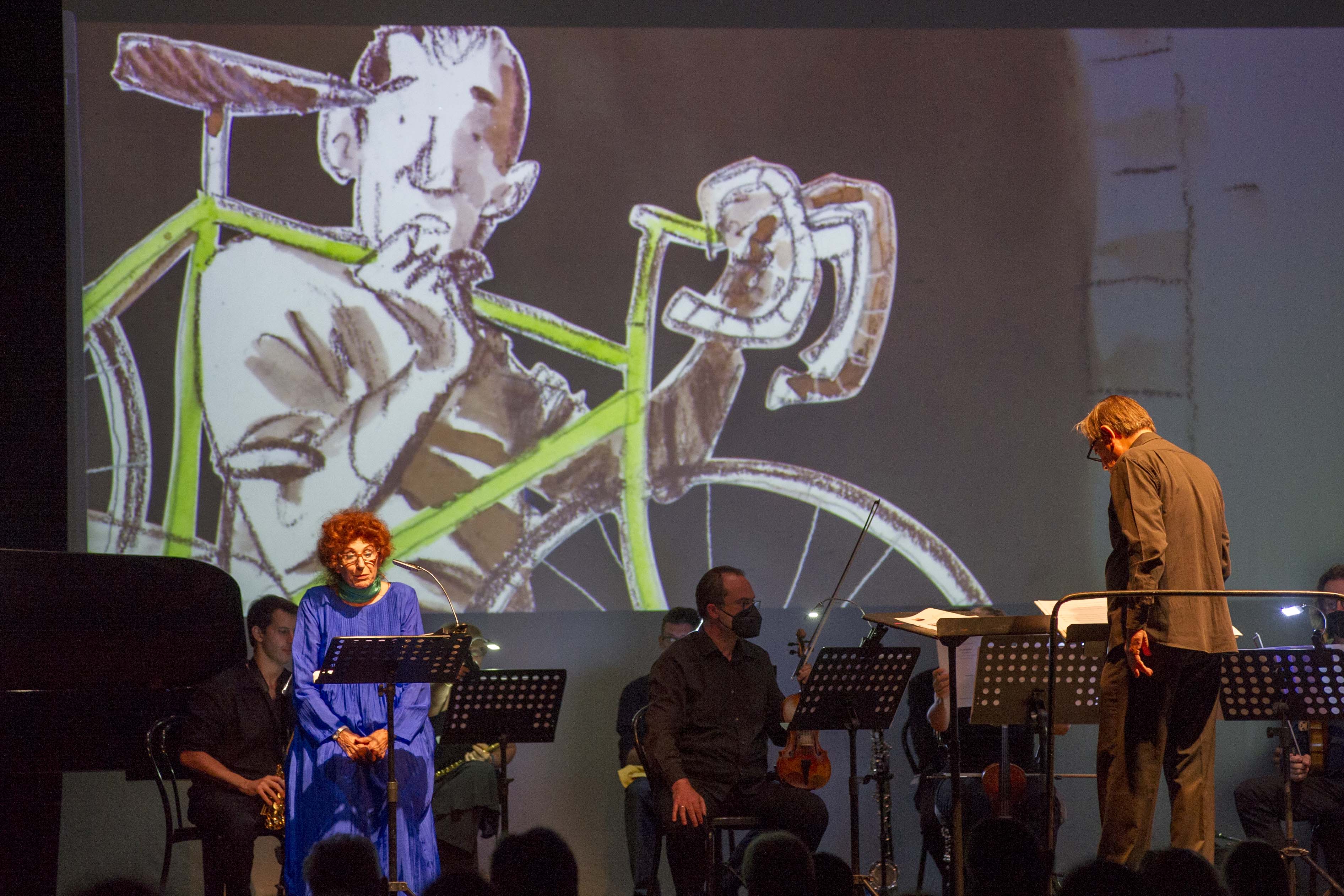 Esperienze distillate nel tempo e, ora, in una partitura finemente cesellata nella strumentazione, che non s’è fatta mancare anche un cameo per la voce della giovane Fleur Strijbos e ha dato soddisfazione all’ensemble del Festival diretto dall’autore. Freschezza anche raccontata: l’attrice Anna Nogara, che si ricorda interprete in altre musiche nuove (Maderna, Berio), ha dipanato il racconto con sapienza e magistrale classe di diseuse. Recitazione e musica si giovavano delle proiezioni dello studio BOGUSLab per le sobrie illustrazioni Roberto Lauciello. Il tutto in una consonanza d’intenti che il pubblico ha colto e accolto con lunghi applausi.