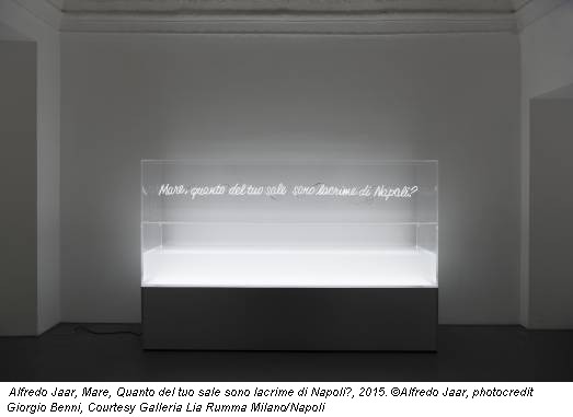 Alfredo Jaar (Santiago Del Cile, 1956) ha portato il livello dell’arte al confronto tra etica ed estetica, denuncia e poetica, forma e funzione. Quest’ultima contrapposizione è un insegnamento, proprio dell’architettura, che l’artista ha raccolto durante gli studi giovanili e portato nella carriera. Più volte Jaar ha affermato di sentirsi un architetto che fa arte, non un artista da studio, sottolineando che i suoi lavori sono nati non dall’immaginazione ma da una ricerca sulle problematiche, sulla storia e sulla cultura del luogo a cui si stava dedicando. Questo approccio si può riscontrare anche all’interno delle sale della galleria di Lia Rumma, dove Jaar ha presentato “Napoli, Napoli”.