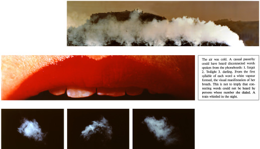 Le grandi stampe fotografiche sono ingrandimenti di un breve momento dell’esistenza, un brandello scomposto nella sua forma e, contestualmente, descritto nel linguaggio. La composizione è strutturata intorno alle misure rigorose dell’inquadratura e delle parole, il cui taglio è sempre netto, incisivo e simbolico, com’è tipico di certa letteratura modernista, in particolare americana, dal John Dos Passos di Manhattan Transfer al William Faulkner di The Sound and the Fury. Il tono è accattivante, nelle immagini e nei testi si aprono luminosi vuoti narrativi che si offrono per essere completati dalla fantasia di chi osserva. Così, la luce e la forma dell’insegna di Paris Bistro (1975) rimandano a una persona che sta entrando nel locale, a ciò che sta succedendo nel club e nella strada antistante, Mao Dead (1976) spicca dalle colonne del New York Post, lasciando immaginare un lettore che sfoglia il giornale e le ombre del mondo che si agitano sulla carta. In Deirdre’s Lip (1978), dalle rosse labbra di Deirdre si avvia un flusso narrativo che, ambientato nei colori del crepuscolo e in una rossa cabina telefonica, conduce all’abbandono dell’amante.