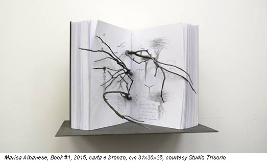 Nell’installazione Orizzonte di parole, gli eventi dei difficili approdi narrati nell’epopea omerica costituiscono la linea alla quale lo sguardo si rivolge, con l’accompagnamento dalle voci del filosofo Pino Ferraro, per la lettura in greco antico, e dell’attrice Iaia Forte, per la traduzione italiana. L’intrecciarsi del dramma epico con le vicende attuali viene metaforicamente rappresentato dal confronto di due lingue lontane nel tempo ma legate da affinità sonore ed etimologiche. Nonostante sia possibile trovare in mostra opere come il libro-scultura Book#1 e gli acquerelli del ciclo Corpi d’acqua, particolarmente vicine al processo ideativo dei Diariogrammi – appunti visivi realizzati dall’artista a partire dal 2009, incentrati sulla dimensione del passaggio/paesaggio interiore – Le storie del vento nasce da un percorso proiettato, in misura maggiore, verso il valore relazionale e dell’incontro. Da tempo, infatti, Marisa Albanese è impegnata nel progetto nomade intitolato “Corpus comune” che, approdato nel giugno scorso a Napoli da Lampedusa e presto completato da un’altra tappa nazionale, segna un importante punto di unione con i rifugiati, i quali ricompongono l’identità smarrita attraverso l’espressività e i materiali artistici. «Le loro radici – racconta Albanese – diventano rami che parlano della loro storia, della loro vita e della loro cultura». Similitudini e divergenze al centro del confronto e dello scambio culturale che coinvolge continuamente, da secoli, l’umanità intera.