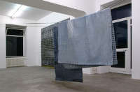 Su due fili, inoltre, sono appesi ad asciugare – come trapunte – due strati di cartapesta fresca appena prodotti: non avendo ancora deciso su quale superficie distenderli i due artisti lasciano che essi lentamente s’induriscano in quella posizione, che, sempre più, appare come la materializzazione della stessa attesa o del dubbio della scelta. Con sorpresa questi due strati di carta rivelano al pubblico il loro lato interno, quello che solitamente viene adagiato sugli oggetti e che sempre rimane nascosto: ciò che è disvelato è la griglia prospettica costituita da volumi cubici con lati arrotondati – la stessa con la quale costruiscono lo spazio dei loro disegni. Questo schema prospettico, con il quale Perino & Vele dimostrano a questo punto di costruire non solo i disegni, ma anche le sculture, costituisce uno spazio “ironico” – perché ortogonale e curvo allo stesso tempo – attraverso il quale, come nello schema lineare che è alla base dell’elaborazione della realtà 3D al computer, gli è possibile ricreare una “propria” realtà tridimensionale.