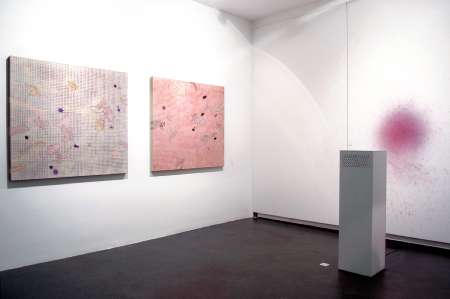 E’ evidente che la giovane artista faentina riflette sul rapporto tra lo spazio e le cose, ma il suo intento non è quello di assegnare agli inserti ricamati un significato metaforico, quanto piuttosto quello di sottolinearne il valore segnico. La ripetizione del pattern crea effetti visivi quasi optical. Sono figure estremamente concrete e insieme stranamente smaterializzate, mobili, vibranti. Ad animare la sala anche un’installazione (Mypaintingmachine) che lancia bolle di sapone colorate e dipinge la parete con schizzi dai colori intensi. Un invito al coinvolgimento per l’osservatore, che può intervenire riempiendo mentalmente gli spazi lasciati vuoti dalla pittura.