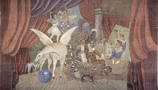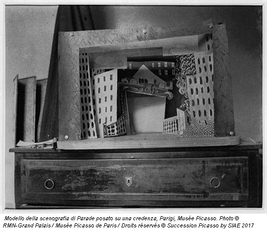 Il sipario di Parade ritrae un paesaggio bucolico in cui spiccano un arco e una colonna, elementi costituiti come in sughero, simili agli allestimenti presepiali ai quali Picasso era interessato. Durante il suo soggiorno a Napoli, guidato dal futurista napoletano Cangiullo, Picasso visitò il Museo di San Martino, dove rimase incantato dalle fattezze delle figurine dei pastori, di cui apprezzò proprio l’umiltà dei materiali, come colla, sughero, legno. Inoltre, vide il teatro Sancarlino, distrutto nel 1884, riprodotto e comprato dal direttore del Museo di San Martino, Spinazzola, per il piano dedicato alla commedia dell’arte a pulcinella e al teatro. Come ci racconta lo storico Carmine Romano, tra i saggisti presenti nel catalogo della mostra, Picasso visitò anche l’Acquario di Napoli, dove poté osservare gli affreschi di tedesco Hans von Marées da cui rimase impressionato e dove è visibile una scena conviviale con cane.