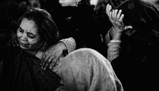 Holi si celebra il giorno successivo alla prima notte di luna piena del mese di phalgun, corrispondente grossomodo a febbraio, una ricorrenza osservata nelle regioni induiste per festeggiare l’ingresso della primavera ma diventata evento di risonanza mondiale. Una pioggia fitta di pigmenti compone un vortice di corpi e colori, posandosi sulle membra delle persone infervorate nella calca festante, tutti gli spazi sono saturi di tinte sgargianti, le profondità si scompongono nell’astrazione e acquistano nuove dimensioni tonali. Per riprendere questo groviglio barocco e rendere la portata collettiva dell’evento, Gibotta ha scelto punti di vista eccentrici, prevalentemente dall’alto ma a pochi passi dall’azione, come si addice alla forma del reportage. Per la cerimonia di cremazione, l’obiettivo fotografico segue un percorso inverso, avvicinandosi espressivamente sui particolari dei volti contratti, sulle mani annodate. Le immagini sfumano nella staticità, l’intreccio ridondante si scioglie nel rigoroso chiaroscuro e i corpi diventano plastiche sculture del lutto. Isolate da tutto ciò che è esterno, le sensazioni si producono e si consumano in un nucleo intimo, nel quale lo spettatore si introduce in silenzio.