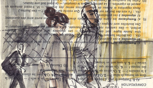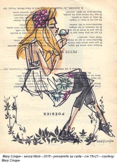 I disegni di Mary Cinque hanno, invece, un soggetto sempre chiaro e ben definito, frutto di una scelta consapevole e non casuale, che si focalizza soprattutto sulle persone. ‹‹Molte di queste sono turisti, persone di passaggio, lo si intuisce dal loro abbigliamento leggero e da un’attitudine svagata. Mi colpisce l’osservazione di una persona che non è del posto ma che lo sta vivendo per la prima volta. Mi soffermo su quello che il turista vede e che noi non vediamo più” afferma l’artista. Quest’apparente differenza di risultati nasconde, in realtà, il senso più profondo della ricerca, perché gli stranieri colgono di una città tutto quello di cui gli abitanti non si accorgono più per via dell’abitudine. Ecco, dunque, rivivere il concetto de ‹‹la realtà è uno sguardo che cambia›› di Perec.