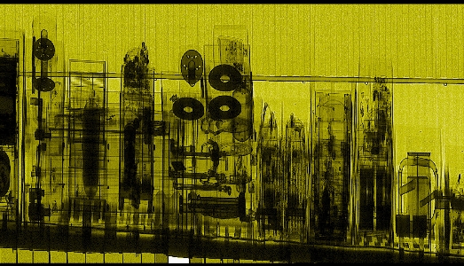 È un lavoro che potrebbe essere definito, con un termine volutamente oftalmico, bifocale. Colpita dal metodo di controllo previsto per i container in arrivo nei porti, letteralmente scansionati così da rivelare forme e contenuto delle merci che accolgono, l’artista ha composto un elaborato iter di immagini radiografiche in cui il colore muta a seconda delle fonti di calore, arrivando in certi punti quasi a colare come tempera in eccesso. Queste affascinanti tele fotografiche sono state realmente scattate dalle Autorità Portuali, al fine di riconoscerne all’interno possibili intrusi. È probabilmente questo l’incipit narrativo di un lavoro di racconto e ricerca che ha imposto un lungo tempo di gestazione e persuasione, data la gelosissima gestione dei dati da parte delle autorità. Anna Santonicola prova a svelare ciò che si sottrae alla vista: strizziamo gli occhi istintivamente per cogliere, tra le altre, figure che sembrano umane.