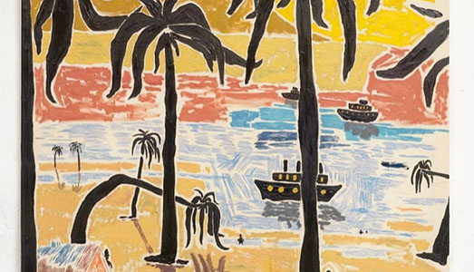 Su una grande tela, corpi di uomini informi, dal grosso ventre e dai fianchi voluttuosi, all’ombra dei palmizi, in una danza tribale e nobile, attendono lo sbarco delle navi coloniali scorte all’orizzonte. Il disegno dei personaggi è stilizzato e i colori sono allo stesso tempo contrastati e mescolati. Fondamentalmente, la palma è simbolo della spinta verso la totalità cosmica, della totalità del cosmo nella sua genesi e nel suo divenire. Knop mantiene l’uso del colore puro e l’organizzazione della superficie pittorica attraverso i contrasti di coppie complementari. Per capire il significato del mare che separa gli indigeni dai colonizzatori è invece necessario soffermarsi sul suo valore simbolico. In Occidente, come nel vicino Oriente, il mare è simbolo del caos primordiale, della morte, del nulla e del male, luogo popolato da mostri. Knop richiama l’attenzione sul fatto di aver ritratto un mondo in giallo, dove il sole è simbolo della rivelazione. Il significato del giallo è, però, ambivalente: il sole, come la spiaggia, color zolfo è associato tanto alla colpa quanto al diavolo.