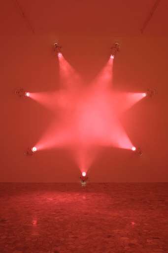 È una scultura psicotropa, allora, la stella rosa shocking plasmata da spot e bruma artificiale, quasi un’elastica tensostruttura che aspetta solo d’essere toccata, salvo svanire come un miraggio, in un’atmosfera ipnotica e fervente da calidarium tecnologico, in cui spazio e luce si dissolvono l’uno nell’altro al ralenti, simile ad un avvolgente stadio di languida allucinazione.