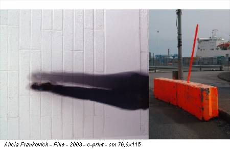 Alicia Frankovich (Tauranga, 1980) è un corpo teso che anagramma le leggi di gravità del corpo umano. Acrobazie semiotiche e azioni fisiche, documentate con registrazioni video e stampe fotografiche. Cimeli e tasselli concettuali catturati per le strade di Melbourne, Dublino e lo stesso spazio espositivo con Pike (2008), la migliore delle opere in mostra, che accosta scatti: da un lato, la mezza figura che cattura le gambe femminili che eseguono un “pike”, il carpiato con le ginocchia tese; dall’altro, la fotografia di uno spartitraffico arancione.